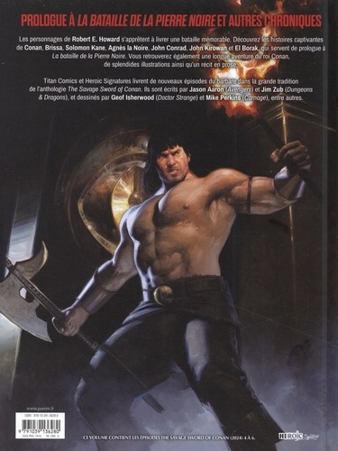 Les personnages de Robert E. Howard s'apprêtent à livrer une bataille mémorable. Découvrez les histoires captivantes de Conan, Brissa, Solomon Kane, Agnès la Noire, John Conrad, John Kirowan et El Borak, qui servent de prologue à La bataille de la Pierre Noire. Vous retrouverez également une longue aventure du roi Conan, de splendides illustrations ainsi qu'un récit en prose. Titan Comics et Heroic Signatures livrent de nouveaux épisodes du barbare dans la grande tradition de l'anthologie The Savage Sword of Conan. Ils sont écrits par Jason Aaron (Avengers) et Jim Zub (Dungeons & Dragons), et dessinés par Geof Isherwood (Doctor Strange) et Mike Perkins (Carnage), entre autres.