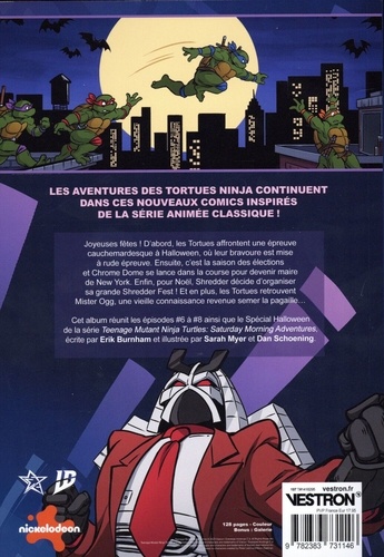 Les aventures des Tortues ninja continuent dans ces nouveaux comics inspirés de la série animée classique ! Joyeuses fêtes ! D'abord, les Tortues affrontent une épreuve cauchemardesque à Halloween, où leur bravoure est mise à rude épreuve. Ensuite, c'est la saison des élections et Chrome Dome se lance dans la course pour devenir maire de New York. Enfin, pour Noël, Shredder décide d'organiser sa grande Shredder Fest ! Et en plus, les Tortues retrouvent Mister Ogg, une vieille connaissance revenue semer la pagaille... Cet album réunit les épisodes #6 à #8 ainsi que le Spécial Halloween de la série Teenage Mutant Ninja Turtles : Saturday Morning Adventures, écrite par Erik Burnham et illustrée par Sarah Myer et Dan Schoening.