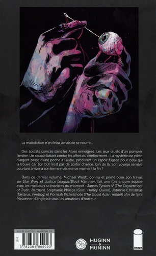 Des soldats coincés dans les Alpes enneigées. Les jeux cruels d'un pompier familier. Un couple luttant contre les affres du confinement... La mystérieuse pièce d'argent passe d'une poche à l'autre, procurant un espoir fugace pour celui qui la trouve car son but n'est pas de porter chance, loin de là. Son voyage semble pourtant arriver à son terme mais est-ce vraiment la fin ? Dans ce dernier volume, Michael Walsh, connu et primé pour son travail sur Star Wars et Justice League/Black Hammer, fait une fois encore équipe avec les meilleurs scénaristes du moment : James Tynion IV (The Department of Truth, Batman), Stephanie Phillips (Grim, Harley Quinn), Johnnie Christmas (Tartarus, Firebug) et Ponsak Pichetshote (The Good Asian, Infidel) afin de faire frissonner d'angoisse tous les amateurs d'horreur.