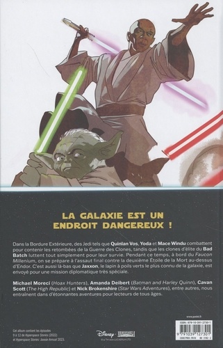 Dans Bordure Extérieure, des Jedi tels que Quinlan Vos, Yoda et Mace Windu combattent pour contenir les retombées de la Guerre des Clones, tandis que les clones d'élite du Bad Batch luttent tout simplement pour leur survie. Pendant ce temps ; à bord du Faucon Millenium, on se prépare l'assaut final contre la deuxième Etoile de la Mort au-dessus d'Endor. C'est aussi là-bas que Jaxxon, le lapin à poils verts le plus connu de la galaxie, est envoyé pour une mission diplomatique très spéciale. Michael Morecf (Hoax Hunters), Amanda Delbert (Batman and Harley Quinn), Cavan Scott (The High Republic) et Nick Brokenshire (Star Wars Adventures), entre autres, nous entraînent dans d'étonnantes. aventures pour lecteurs de tous âges.