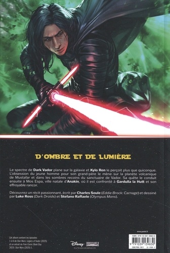 L'ombre de Dark Vador plane sur toute la galaxie Star Wars et tout particulièrement dans l'esprit de son petit fils, Kylo Ren ! La sombre obsession du jeune homme pour le Seigneur Noir des Sith le mène jusqu'à Mustafar. Mais quels secrets la Forteresse Vador cache-t-elle au leader du Premier Ordre ? Quel visage du passé le guidera dans sa quête ? Le voyage formateur de Ren le conduit ensuite sur Tatooine, la planète natale d'Anakin Skywalker, où il doit affronter Gardulla la Hutt et ses gardes, mais aussi un rancor redoutable ! Les secrets du passé seront exhumés dans les sables impitoyables de Mos Espa ! Même dans une époque où Vador n'est plus, son influence reste centrale. Qui mieux que Charles Soule (Dark Vador : Le Seigneur Noir des Sith, L'Ascension de Kylo Ren) pour poursuivre cette exploration ? Il est ici accompagné du talentueux Luke Ross, déjà à l'oeuvre sur Le Réveil de la Force et Star Wars : Allegiance.