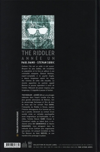 Dans le film à succès de Matt REEVES, The Batman, le Riddler n'est pas simplement un joyeux excentrique ayant un goût prononcé pour les jeux de mots et les indices déconcertants, mais un véritable psychopathe aussi énigmatique qu' impitoyable. Comment Edward Nashton, expert-comptable fragile et invisible, a t-il pu devenir l'un des pires criminels de Gotham ? Plongez dans l'histoire sombre et glauque d'un homme en marge de la société, refusant de passer inaperçu plus longtemps.