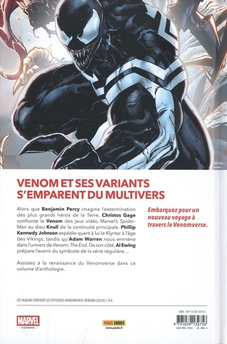 Alors que Benjamin Percy imagine l'extermination des plus grands héros de la Terre, Christos Gage confronte le Venom des jeux vidéo Marvel's Spider-Man au dieu Knull de la continuité principale. Phillip Kennedy Johnson expédie quant à lui le Klyntar à l'àge des Vikings, tandis qu'Adam Warren nous emmène dans l'univers de Venom : The End. De son côté, Al Ewing prépare l'avenir du symbiote de la série régulière... Assistez à la renaissance du Venomverse dans ce volume d'anthologie.