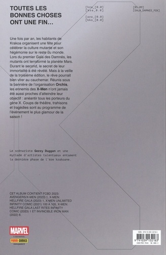 Chaque année, le Gala des Damnés est l'événement qui souligne la réussite des mutants et célèbre l'utopie créée sur Krakoa. Mais les ennemis des X-Men, au premier rang desquels l'organisation Orchis, n'ont pas dit leur dernier mot... loin de là ! Cette année, c'est un carnage qui attend les mutants, signant le début de la fin pour Krakoa. Coups de théâtre, trahisons et tragédies sont au programme de la soirée ! La dernière phase de l'ère House of X / Powers of X commence avec cet album qui voit s'écrouler tout ce qu'ont construit les mutants. Les architectes de la saga des X-Men ont clairement en tête le "Mariage Rouge" de Game of Thrones dans les pages de cet album, qui intègre par ailleurs Iron Man au drame des mutants.