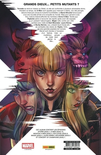 Grands dieux... petits mutants ? Tornade se rend en mission au Brésil, Où elle est confrontée à plusieurs adversaires divins. Pendant ce temps, les X-Men sont appelés pour intervenir à Merle, une ville plongée dans le chaos par une jeune mutante incontrôlable. Le Baron Strucker lance quant à lui une nouvelle armée à la conquête du monde. Mais pour parvenir à ses fins, il devra d'abord affronter les membres d'Arme X-Men. Tandis que Psylocke peine à recouvrer ses esprits après avoir été exposée à un puissant hallucinogène, Magie lutte contre son côté sombre avec l'aide de Dani Moonstar. Laura Kinney et Bucky Barnes, eux, unissent leurs forces afin de combattre des robots de l'Hydra. Enfin, les plus grandes popstars de l'univers Marvel sont réunies à l'occasion d'un festival, mais un mystérieux groupe de metal vient gâcher la fête...