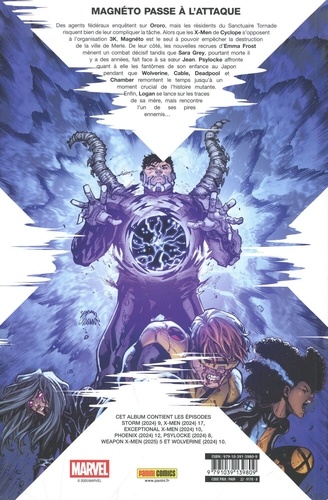 Des agents fédéraux enquêtent sur Ororo, mais les résidents du Sanctuaire Tornade risquent bien de leur compliquer la tache. Alors que les X-Men de Cyclope s'opposent à l'organisation 3K, Magnéto est le seul à pouvoir empêcher la destruction de la ville de Merle. De leur coté, les nouvelles recrues d'Emma Frost mènent un combat décisif tandis que Sara Grey, pourtant mode il y a des années, fait face a sa soeur Jean. Psyloeke affronte quant à elle les fantomes de son enfance au Japon pendant que Wolverine, Cable, Deadpool et Chamber remontent le temps jusqu'à un moment crucial de l'histoire mutante. Enfin, Logan se lance sur les traces de sa mère, mais rencontre l'un de ses pires ennemis...