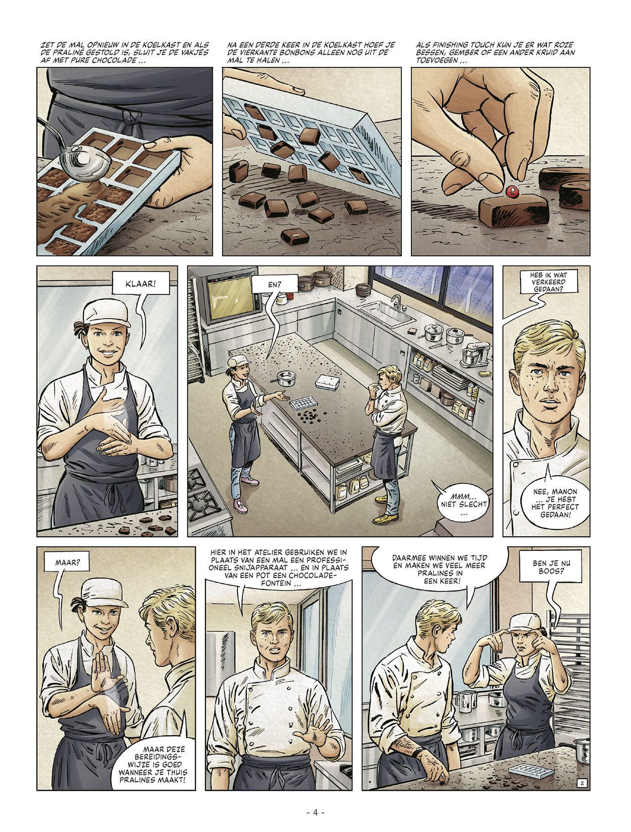 Deel 3/3 - Corbeyran weet altijd te boeien met zijn scenario’s, en zorgt met zijn Meester-chocolatier voor een heerlijke inkijk in de troebele wereld van de (Belgische) chocolade - Dit slotdeel van De meester-chocolatier bulkt van de spanning, maar tegelijk leer je ook wat bij over het maken van pralines. - De meester-chocolatier is als een praline gevuld met aardbeienlikeur: heerlijk verrassend! De misdadigers waarmee Benjamin twijfelachtige akkoorden heeft gesloten, worden steeds dreigender. Manon ontdekt een cacaoplantage in Vietnam en Alexis maakt van die ontdekking gebruik om het gevaar te ontvluchten. Onder leiding van de organisatie die de plantage leidt, treffen ze er bonen aan met een bijzondere smaak, waarmee ze hun creaties misschien wel kunnen vervolmaken.