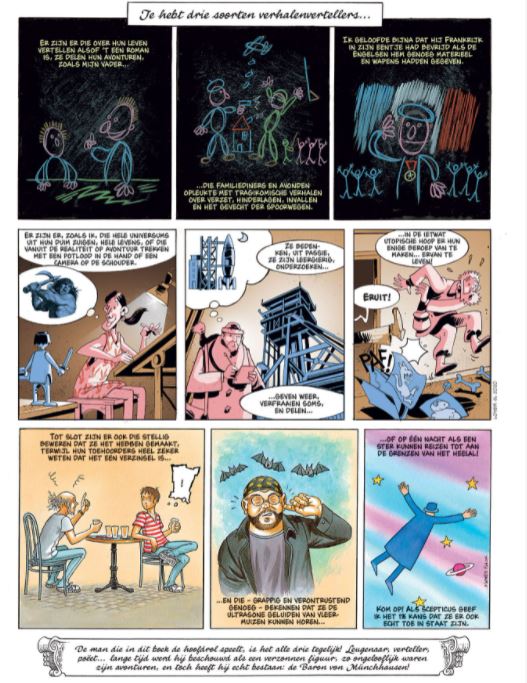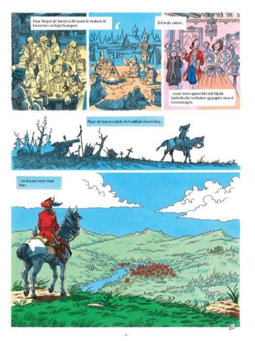 Striptekenaar Masbou kennen we bij ons vooral van zijn reeks Sabels en Galjoenen Hierbij een one shot met verhaal gebaseerd op het sprookje van de Baron von Münchausen. Korte inhoud In de herfst van zijn leven krijgt de Baron von Münchhausen te horen dat er een boek is verschenen over zijn avonturen. Een boek dat hem populariteit oplevert, en een zekere naamsbekendheid over de grenzen heen, jazeker, maar… het confronteert hem ook met zijn eigen sterfelijkheid. Bovendien is de Baron een rasverteller en niet zomaar een held van papier. Daarom besluit de Baron voor een laatste keer de puntjes op de ü te zetten, en niemand doet dat zo bevlogen als de Baron von Münchausen!