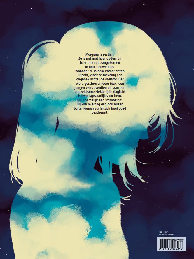 Gemiddelde score 5 / 5Deze magnifieke hardcover gaat over Morgane, een meisje van zestien jaar dat net met haar ouders en haar broer verhuisd is. Bij het uitpakken, vindt ze toevallig een dagboek achter de radiator. Het dagboek werd geschreven door een jongen van zeventien jaar, Max. Hij lijdt aan een erg zeldzame ziekte waarbij daglicht levensgevaarlijk is voor hem. Max is een ‘maankind’. Overdag kan hij alleen maar buitenkomen als hij zich heel goed beschermt. Morgane is gefascineerd door het dagboek. Ze zou graag weten of Max nog leeft… Zal ze hem vinden…? Dit album bestaat uit 56 pagina’s die gedrukt werden op zeer stevig papier en is een pareltje! De cover alleen al is prachtig: het contrast van het donkere lichaam met de lichte achtergrond spreekt voor zich. Maankinderen, zoals Max in het verhaal, leven ook voornamelijk in de duisternis, deze cover geeft dit dan ook zeer mooi weer! Wanneer je het boek omdraait, zie je een licht silhouet van een vrouw afgebeeld op een donkere achtergrond. Deze illustratie stelt Morgane voor. Deze twee tegengestelden worden prachtig weergegeven. Wanneer je het boek gelezen hebt, begrijp je zeker de keuze om de cover en de achterkant op deze manier voor te stellen. De schrijver, Joris Chamblain, switcht in het verhaal ook tussen het leven van Morgane en het leven van Max uit het dagboek. Er zijn dus zeer duidelijk twee verhaallijnen aanwezig in deze graphic novel en ook twee hoofdpersonages. Deze twee verhaallijnen zorgen voor een zekere dynamiek in het boek. De illustraties werden getekend door Anne-Lise Nalin en zijn zeer gedetailleerd en aangenaam om naar te kijken. Contrasten tussen licht en donker komen uiteraard vaak voor in deze strip. Het donkerblauwe van de nacht tegenover het lichte, heldere en warme kleurgebruik van de dag. De tekeningen stralen een zekere kwetsbaarheid en gevoeligheid uit en werden zeer realistisch getekend. Het hoofdpersonage, Morgane, oogt ook zeer kwetsbaar, maar haar engagement om ‘maankinderen’ zoals Max te helpen is bovendien zeer mooi om te zien. Daarenboven geeft deze strip inzicht in de aandoening ‘Xeroderma Pigmentosum’, een zeer zeldzame, erfelijke huidziekte waarbij er zeer snel schade optreedt, vooral aan huid en ogen, door blootstelling aan zonlicht. Van deze aandoening zal je misschien al wel eens iets gehoord hebben, maar weten wij als buitenstaanders eigenlijk nog niets zoveel vanaf. Dit emotioneel geladen verhaal is echt de moeite waard om te lezen, als kind vanaf een jaar of 10, maar zeker ook als volwassene. De uitgever en de auteurs doneren trouwens een deel van de opbrengst van deze graphic novel aan de vereniging ‘Enfants de la Lune’.