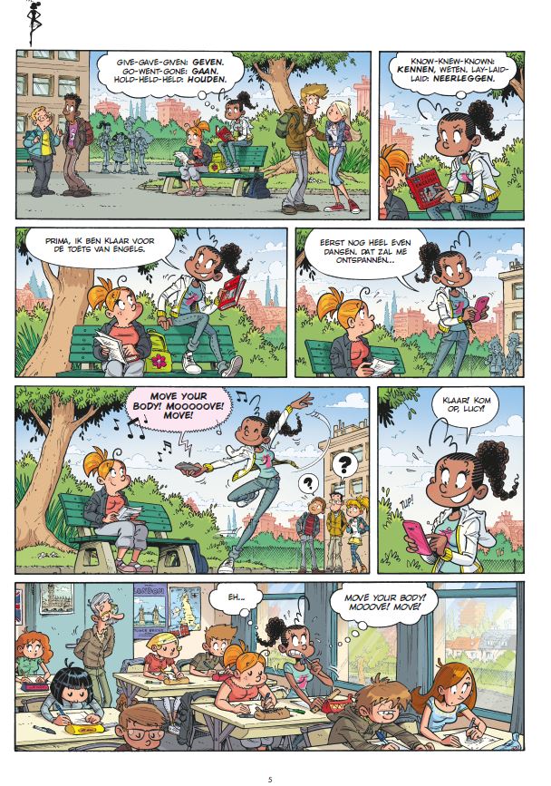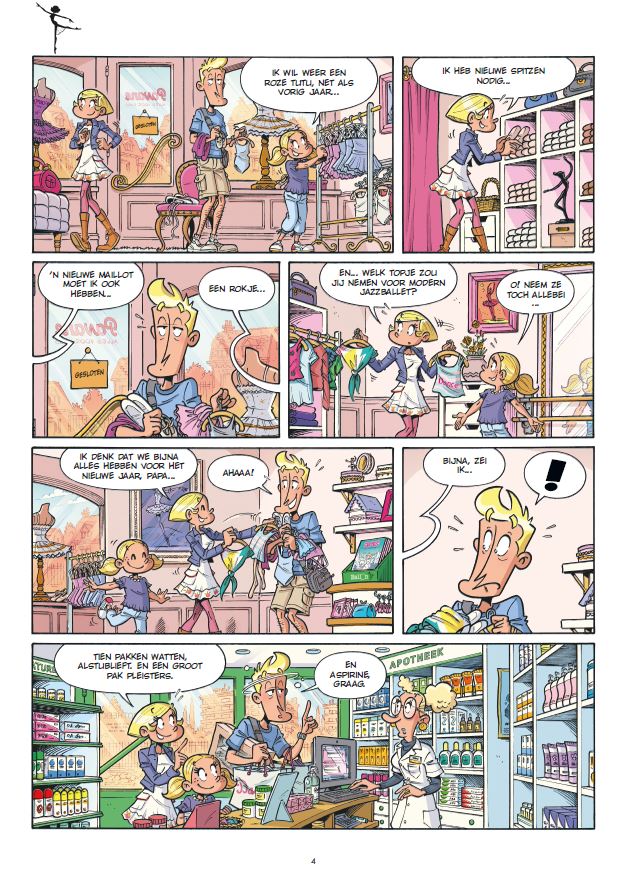 Gemiddelde score 4 / 5Julia, Lucie en Laila zitten samen op dansles. Eerst maken we kennis met hen en hun dagelijkse leventje thuis, op school en in de Dance Academy. Daar heeft een nieuwe leerling, Maya, zich net ingeschreven voor de dansles. Ze speelt al zes jaar basketbal en dit is dan ook haar grote passie. Haar moeder wil dat ze klassiek ballet probeert, omdat ze schrik heeft dat ze er later spijt van krijgt als ze dat niet volgt. Maya mist het groepsgevoel bij ballet en is vastberaden om dit de andere meisjes bij te brengen. Deze vastberadenheid gaat gepaard met de nodige rivaliteit. Er wordt bovendien ook nog hard gewerkt aan de choreografie van een Afrikaanse dansvoorstelling om het jaar mee af te sluiten. Dit stripalbum is het twaalfde deel in de serie over Dance Academy, een leuke serie over drie hippe en vrolijke meiden die allen 1 passie delen: dansen. We volgen hen in hun dagelijkse leven thuis en op de Dance Academy, waar ze allerlei avonturen beleven. De teksten in de tekstballonnen zijn eenvoudig, kort en makkelijk te lezen. Hierdoor leest de strip zeer vlot. Er gebeurt ook telkens wel iets, er vinden allerlei gebeurtenissen plaats zoals bijvoorbeeld de vader van Julia die zich plots waagt aan zijn eerste balletpassen of de opdracht die de meiden krijgen om een eigen choreografie te maken op een stukje uit een klassiek ballet…Uiteraard komen er ook enkele technische termen aan bod uit de balletwereld, zien we heel wat tutu’s, spitzen en maillots de revue passeren. De echte balletliefhebber zal dus zeker plezier beleven aan dit album. Het verhaal speelt zich af in verschillende situaties, de ene keer zijn de meiden op de Dance Academy, dan zijn ze weer aan het strand, op school of in het park. In deze strip wordt ook heel wat humor gebruikt en komen er allerlei grappige omstandigheden naar boven, wat zeker een meerwaarde is bij dit verhaal. De illustraties worden ook zeer gedetailleerd weergegeven en er worden ook heldere, vrolijke en levendige kleuren in gebruikt. Deze tekeningen geven zo een vrolijke sfeer weer. Wie houdt van een wereld vol dans, vriendschap en meiden zit met deze strip aan het juiste adres! Voor kinderen makkelijk zelf te lezen vanaf 7 à 8 jaar.