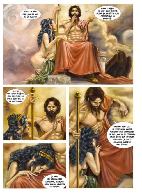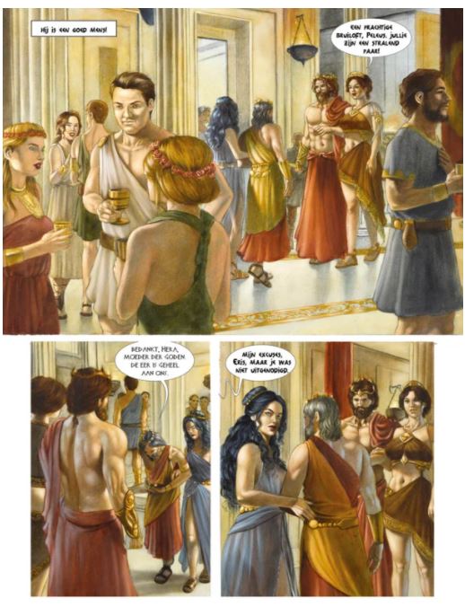 -10% op alle nieuwe DDB uitgaven Met deze reeks laat Cosimo Ferri de lezer kennismaken met een monument van de westerse cultuur: Homerus, Griekse mythologie, en dan met name Achilles, de grootste held van allemaal. Trouw aan de beroemde boeken van Homerus (de Ilias), Stasinus van Cyprus (de Cypra) en Arctinus van Milete (Aethiopis), verrijkt hij zijn tekenwerk met inspiratie uit klassieke en moderne schilderijen en sculpturen. Het resultaat is een uitbundig, groots werk dat liefhebbers van geschiedenis, literatuur en erotiek zeker zal kunnen bekoren. Als eerste deel van de reeks vertelt dit album over het begin van de avonturen van de grote Griekse held: zijn goddelijke geboorte, zijn jeugd onder opvoedkundige leiding van de centaur Chiron en zijn vertrek naar Troje. Op de bruiloft van Peleus en Thetis, de ouders van Achilles, zijn alle goden uitgenodigd, behalve Eris, godin van de onenigheid. Uit wraak laat ze een gouden appel achter met daarop de tekst: “Voor de mooiste”. Drie godinnen claimen het geschenk: Hera, Athena en Aphrodite. Om een einde te maken aan het geschil wijst Zeus de sterveling Paris aan om een winnaar te bepalen. De jongeman geeft de appel aan Aphrodite, godin van de liefde, die hem in ruil daarvoor de eeuwige liefde belooft van de mooiste aller stervelingen: Helena. Het probleem is dat Helena al getrouwd is met Menelaos, de koning van Sparta. Paris ontvoert de schone Helena en begint zo een alles verwoestende Griekse oorlog omdat alle Griekse prinsen hebben gezworen te komen helpen mocht iemand Helena durven schaken. Menelaos trekt daarom ten strijde, omringd door de grootste helden: Odysseus, Ajax en... Achilles.