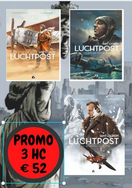 GELIMITEERDE HARDCOVER OPLAGE van EEN COMPLEET VERHAAL IN DRIE HARDCOVERS VOOR SLECHTS 52 € IPV 59.85 € Het grote avontuur van de pioniers van de luchtvaart. Deze avonturier Antoine Saint-Exupéry is de schrijver van 'De kleine prins' dat geldt als een van de beste, en het vaakst vertaalde boek uit de Franse literatuur. In een subtiel fictieverhaal, geïnspireerd door waargebeurde feiten, vertellen Pierre-Roland Saint-Dizier en Cédric Fernandez de historie van de Aéropostale door de ogen van de mensen die er werkten, vaak met gevaar voor hun eigen leven. INHOUD: Tijdens de vlucht is de wind je bondgenoot ... of je ergste vijand. Oktober 1929. Antoine de Saint-Exupéry, benoemd tot hoofd van het verkeer voor Aeroposta Argentinië, arriveert in Buenos-Aires. Zijn missie is om de lijn uit te breiden naar Patagonië, net op het moment dat nachtvluchten steeds meer gegeneraliseerd worden en de concurrentie sterker wordt. Tijdens zijn verblijf werkt hij aan een roman over de nacht en de wind, twee elementen waarmee de vliegers in Argentinië vaak worden geconfronteerd, vooral als het gaat om het vliegen over de formidabele Cordillera van de Andes. Maar de economische crisis van 1929 zal de kolos doen schudden aan de voet van klei die Aéropostale is. Niets zal dan zijn als voorheen ... Klaar voor het ultime avontuur