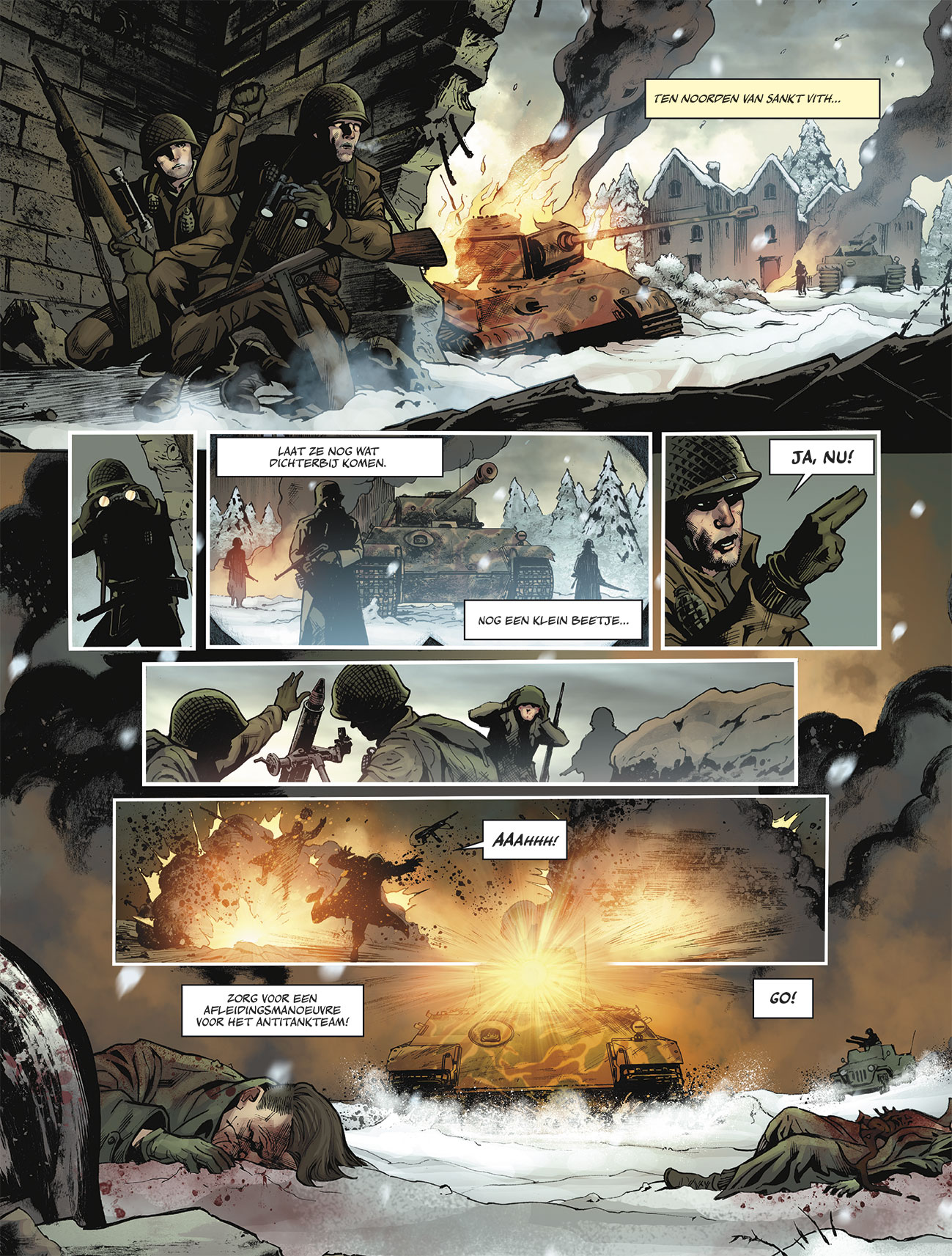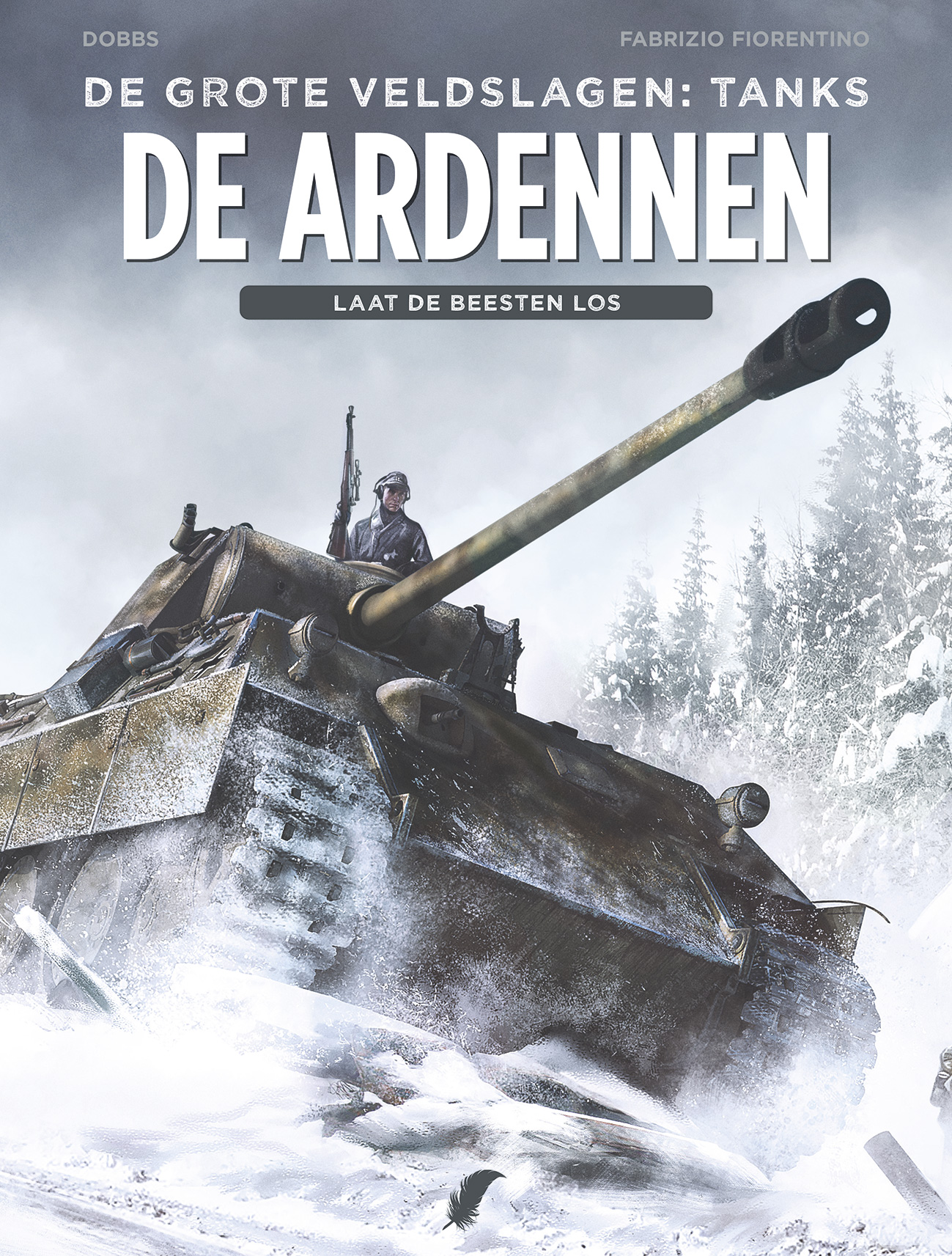 Gemiddelde score 4 / 5De laatste keiharde veldslag in beestig koude Ardennen De laatste jaren kwam er veel aandacht voor de Tweede Wereldoorlog, vooral ook in strips. Tanks en hun bemanningen spreken tot de verbeelding en waren al een paar keer het thema. Onder andere in De Ster van Koersk van Silvester, waarin een vrouwelijke Russische ingenieur en tankbestuurder centraal staan. Velen hebben intussen historische werken over de Slag om de Ardennen gelezen zoals van Anthony Beevor. Die wetenschappelijke werken zijn natuurlijk niet te kloppen wat de diepgang en het detail in feitenmateriaal en verhaal betreft maar... de echte stripliefhebber wil soms meer. De strip Tanks 2: De Ardennen - Laat de Beesten Los van uitgeverij Daedalus op scenario van Dobbs en getekend door Fabrizio Florentino heeft zijn waarde. Het betreft een ware onderdompeling in de harde actie. Je voelt de winterkoude die de soldaten en officieren van beide kampen tussen 16 december 1944 en 16 januari 1945 zo berucht parten heeft gespeeld van de pagina’s wasemen. Deze slag werd het onderwerp van een van de eerste films die over de Tweede Wereldoorlog werd gemaakt en die in antiquariaat nog te vinden is: het mooie Battleground Ardennes. Daarin vallen de vriendelijke karaktertekeningen op. Deze strip valt van zijn kant op door een soort schokeffect waarmee je in de brutale oorlogsrealiteit belandt. Gelukkig neemt het aantal bloedende slachtoffers na een paar pagina’s af… De makers hebben dus de belevingswaarde de klemtoon gegeven, maar zij bieden ook een aantal interessante feiten. De Battle of the Bulge, zoals de Amerikanen zeggen, was een soort wanhopige laatste gok van de Führer, een opzet waarmee vooraanstaande generaals het meteen niet eens waren. De door Gerd von Rundstedt gevreesde mislukking is er helaas voor de Duitsers gekomen. Het grootste deel van dit verhaal laat je meeleven met de gevreesde Duitse Panzer-divisies. Dat is vrij verfrissend, want gedurende decennia gold voor allerlei media: de overwinnaar schrijft de geschiedenis, de Amerikanen en Britten dus. De makers van deze strip nemen je enkele dagen mee met de bemanning van een verdwaalde tank en dat werkt. Je leert de personages kennen en hun onderlinge verhoudingen evenals de onnoemelijke uitdagingen en problematische verrassingen waarmee deze mannen werden geconfronteerd. Terecht laten de makers uitkomen dat niet alle Duitse soldaten geheel onmenselijk waren. Een van de officieren heeft, zoals dit aan het front in werkelijkheid gebeurde, een kat (voor anderen een hond) als persoonlijke compagnon. Strijders worstelen met ethische vragen, bijvoorbeeld hoe ze gevangenen zullen behandelen. Je bent getuige hoe de twijfel aan de onoverwinnelijkheid van dit sterke leger einde 1944 afbrokkelt. Het blijft een raadsel hoe Adolf Hitler de mensen tot op het allerlaatst wist op te zwepen. Zijn propagandamachine onder Joseph Goebbels zit daar natuurlijk voor iets tussen. Zoals de populaire film The Battle of the Bulge uit 1965 met Robert Shaw laat zien, brachten de Duitsers als Amerikaanse soldaten verklede commando’s in het spel onder leiding van de fameuze kolonel Otto Skorzeny. Die mannen moesten info vergaren en verwarring stichten. Een ander waarachtig detail is hoe zelfs tanks met hun brede rupsbanden aan het slippen gingen op de hard bevroren wegen in de Ardeense dorpjes en bossen. Documentaires die recent beschikbaar kwamen, laten dit spektakel in originele beelden zien. Een ander ruig feit is dat vele Duitse soldaten opwekkende drugs namen, niet geheel verschillend van hun leider in Berlijn! Idem voor de moorden die op krijgsgevangenen zijn begaan. Een bezoek aan het Museum voor Krijgsgeschiedenis in Brussel kan je leren dat die misdaden aan beide zijden zijn voltrokken. Duitse SS'ers, maar ook Amerikanen hebben in de Ardennen een kleine honderd ontwapende soldaten afgemaakt. Dit vormde een flagrante overtreding van de Conventie van Genève die oorlogshandelingen pogend juridisch reguleert. Bij overtreding kunnen daders (na de oorlog) vervolgd worden. De lectuur van deze pittige strip geeft je zin het Bastogne War Museum (BWM) opnieuw te bezoeken. Of de verstripte vertelling over deze slag op Belgisch grondgebied door Philippe Jarbinet (in de delen Airborne 44 integraal 1 en 3 of de losse delen 1, 2, 5 en 6) ter hand te nemen. Deze auteur biedt heel wat meer op het vlak van plot en diepte en rijkdom in de personages, dat mag gezegd. Zo komt er in de korte maar straffe strip van Dobbs geen énkele vrouw voor, laat staan een romance. Het lijkt intussen geen slechte zaak dat zulk belangrijk stuk geschiedenis verschillende artistieke benaderingen krijgt. Dobbs en zijn kompel laten de rauwe actie weergaloos uitkomen in dit verhaal waarin je voor een uurtje deel bent van de beruchte Kampfgruppe Peiper onder strenge leiding van de bekwame, maar wrede kolonel van die naam. Wie daar meer wil over vernemen, kan terecht in het dossier, maar ook in het indrukwekkende museum Ardennes 44 in het dorp La Gleize waar deze tak van het offensief in een tankslag te pletter liep. De in deze strips beschreven episodes grijpen alleszins terug naar beenharde tijden! Ook al houd je van avontuur, ben je wel zo gelukkig dat je in tijden van vrede leeft als je het boek dichtslaat! Het boek eindigt met een uitstekend informatief dossier geschreven door experten waarin recente data werden verwerkt en waarin verwezen wordt naar bijkomende boeiende musea en media, waaronder de beroemde tv-serie Band of Brothers. Daarin komt in twee afleveringen deze ongelofelijke winterse oorlogsfase aan bod vanuit het standpunt van de Amerikaanse paracommando’s van het 101st Airborne Division. Al deze bronnen bewijzen overigens dat het slagveld een (bijna) exclusief mannelijke aangelegenheid was. Een uiterst intense fase voor de mensheid die lang doorwerkte in het collectieve bewustzijn. De man was daardoor overal voor lange tijd dé man. Een situatie die intussen grotendeels is bijgesteld met m