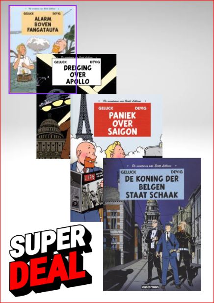Compleet pakket met de 4 delen. Scott Leblanc is dolblij: hij heeft een interview kunnen vastleggen met koning Boudewijn. Op naar Brussel! Maar dan stuurt een groep terroristen alles in de war. Totaal onverwacht schakelen ze Scott uit en vervolgens vermomt een van hen zich als onze geliefde dierenreporter met de bedoeling om tot bij de koning te geraken en hem uit de weg te ruimen. Alsof dat nog niet erg genoeg is, gaan de terroristen nog een stap verder met hun snode plannen... Gelukkig laat professor Moleskine de jonge Leblanc niet in de steek. Leuke parodie op Kuifje, over een reporter (mét kuif) die samen met zijn vriend - een kruising tussen kapitein Haddock en professor Philip Mortimer - allerlei spannende avonturen beleeft. Humor, een klare lijn en een knipoog naar gebeurtenissen uit de sixties. Door Devig en Geluck (De Kat).