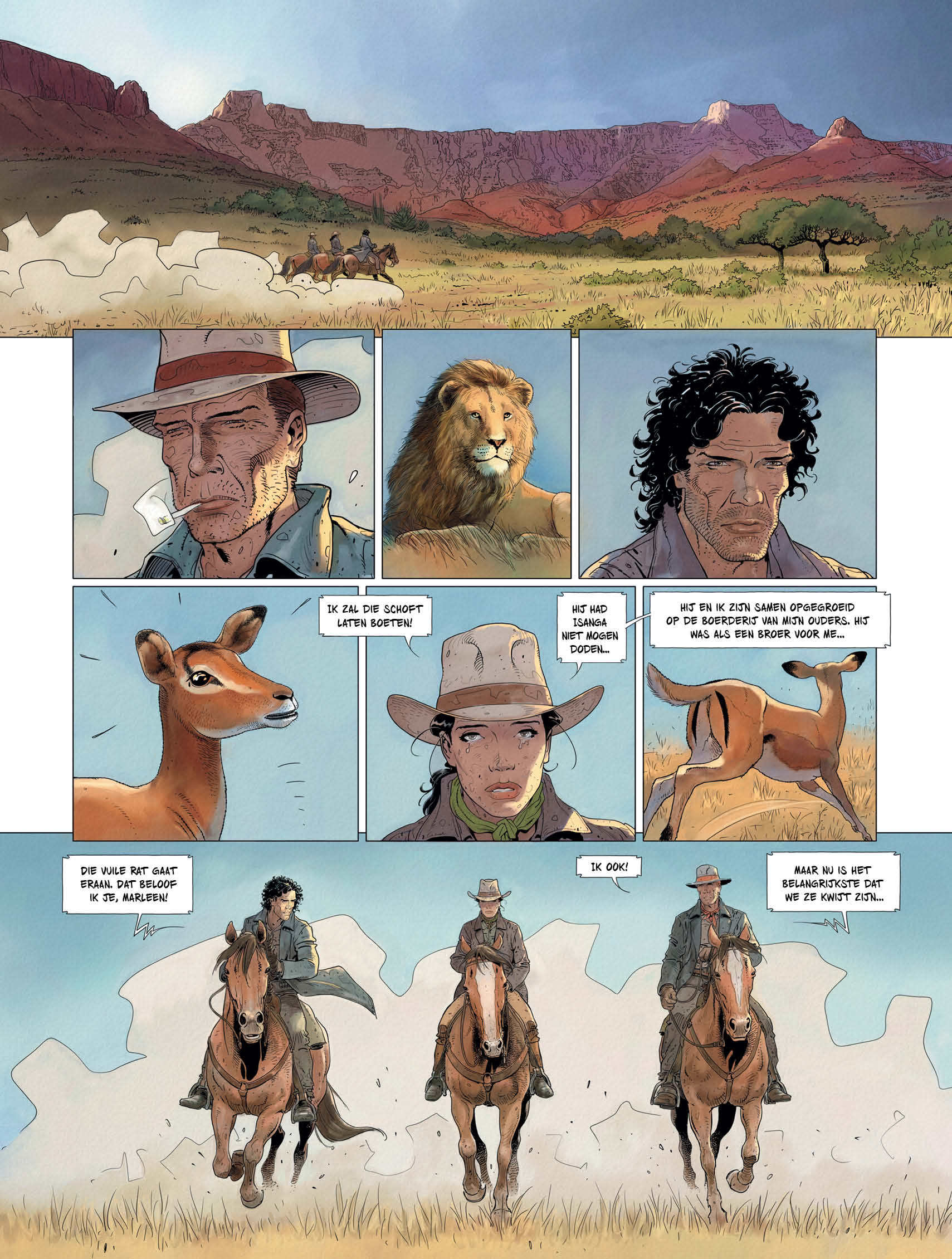 18/06/2024 Volg de belevenissen van een groep avonturiers die op zoek zijn naar een mythische schat uit de Tweede Boerenoorlog. Grote open ruimtes, Zulu-magie, gepantserde treinaanvallen en woeste ritten op een onbekend continent staan op de agenda van deze atypische Zuid-Afrikaanse western! Pit, een voormalige Amerikaanse cavalerie-officier, en Ortzi, een Baskische anarchist, komen begin 20e eeuw aan in zuidelijk Afrika. Paul Kruger is op dat moment president in ballingschap van de republiek Transvaal. Hij vertrouwt hen een missie toe: Ze moeten een schat van 250 ton goud vinden, die tijdens het offensief van de Britse troepen is verstopt. Reizend door de Afrikaanse savanne met zijn dieren en gevaren, kruist hun pad dat van Marleen, een woeste Boer-amazone en haar commando van boersoldaten diep in de bush. Maar ook die van historische figuren, zoals de jonge Winston Churchill, destijds oorlogscorrespondent, en gevaarlijke criminelen die hen op de hielen zitten... Transvaal Tekst: Bartoll Koningskeuze Tekeningen: Bernard Köllé 2/3. De mysterieuze stad Ophir