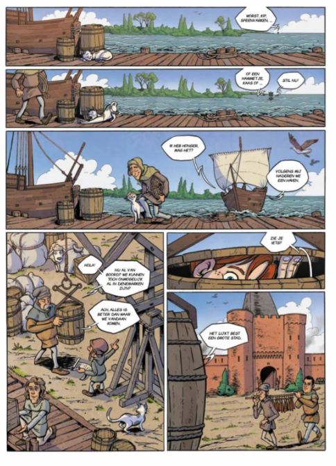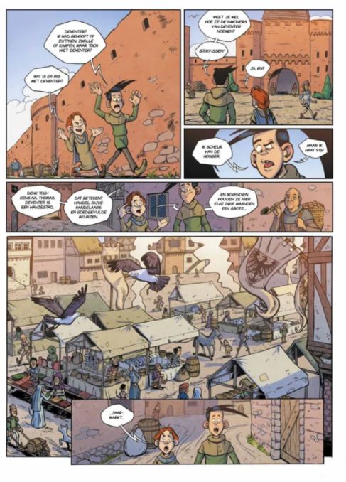 Dit is de hardcover editie met 16 pagina's extra educatieve bijlage. Lees de uitgebreide recensie van David Steenhuyse (ssz) hieronder! De twee weeskinderen Hille en Thomas komen als verstekeningen aan in Deventer, een rijke Hanzestad aan de IJssel. Ze houden zich in leven met kleine diefstallen en beurzensnijden. Als ze worden betrapt krijgen ze een keuze: straf of meewerken aan een complot om een rijke handelaar in diskrediet te brengen. De Bergenvaarders wordt een stripserie die zich afspeelt in het Deventer van 1370, toen de stad een van de machtigste Hanzesteden van Oost Nederland was.