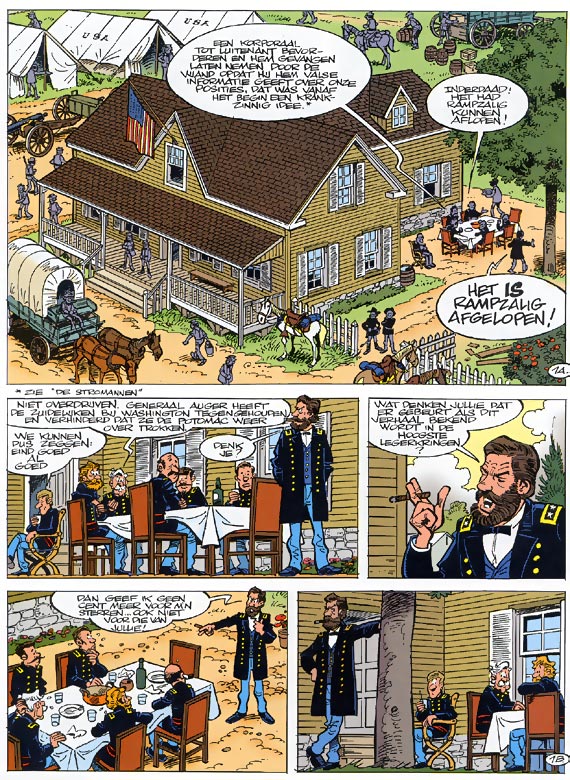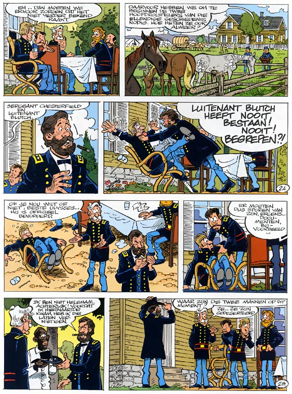 De reeks 'De Blauwbloezen' is een geslaagde mengeling van avontuur en humor. Cauvin gebruikt - zoals hij wel meer doet - historische anekdotes uit de Amerikaanse burgeroorlog om ons hilarische verhalen te vertellen over de perikelen in het leger, waar de hoogste officieren niet per se de slimste zijn... Willy Lambil heeft zich uitstekend gedocumenteerd en maakt van zijn pagina's heldere, intelligente kunstwerkjes. Het resultaat is amusement op hoog niveau, dat door een nog steeds groeiend publiek wordt gewaardeerd.