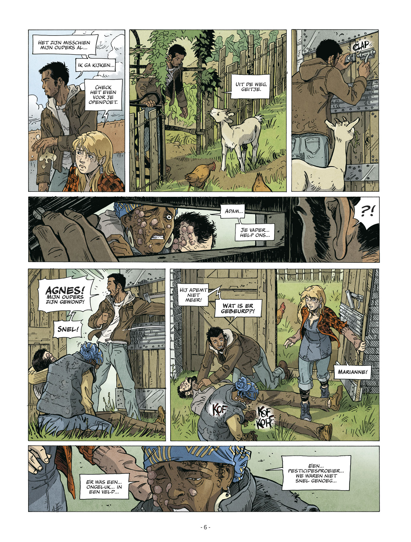Your poison running through my veins In 2068 staat heel Europa onder de invloed van de machtige multinational Diosynta. Zij beslissen welke gewassen er mogen verbouwd worden en controleren de handel van zaden en pesticiden. Heel Europa? Nee, Het Verweer blijft dapper weerstand bieden aan het bedrijf en maakt het leven van het FSI, de Europese krijgsmacht bepaald niet gemakkelijk... Deze strip van Augustin Lebon ticks all the boxes van het dystopische genre dat de laatste jaren zoveel furore maakt en bevat elementen van classics als The Handmaid’s Tale (een allesbepalend bestuur), 1984 (een liefdesverhaal) en Mad Max (de kekke pantserwagens). Door het strakke no-nonsense tempo knalt Lebon echter dwars door alle clichés heen en heb je geen probleem om bij de les te blijven. Tussendoor smeert hij nog een dun laagje maatschappijkritiek over de vertelling heen en waarschuwt hij ons voor totalitaire regimes, GGO’s en de toenemende invloed van multinationals als de Monsanto’s en de Bayers van deze wereld. Daedalus laat direct een eerste cyclus van twee delen op ons los en een volgend tweeluik is in het Frans al voltooid. Laat maar komen: dit genetisch gemanipuleerde doemdenken smaakt naar meer! bron ssz