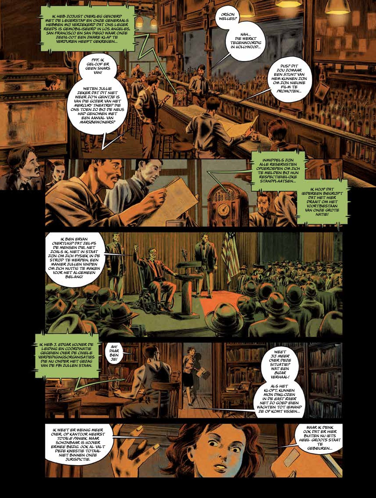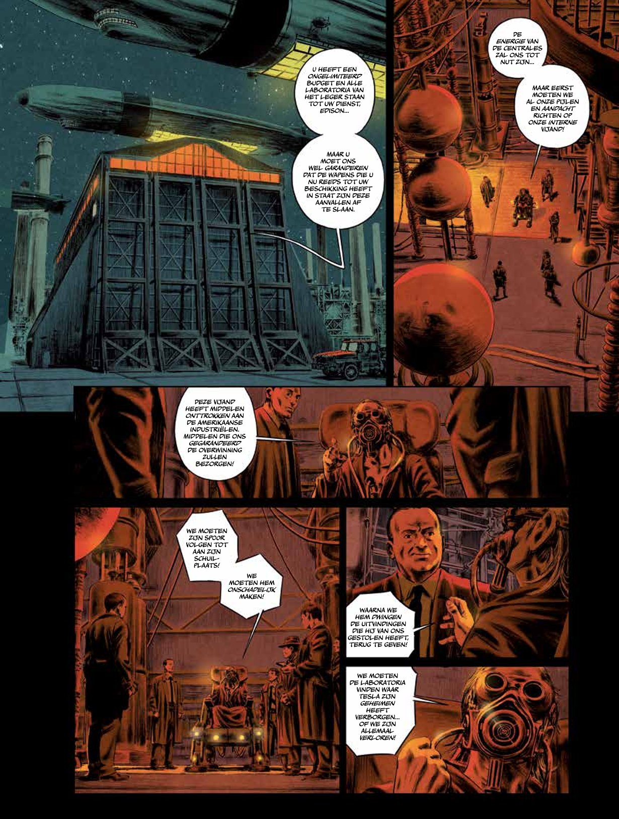 'Geruchten over landing van Duitse onderzeeërs aan de oostkust... Mysterieuze verschijningen en verdwijningen, aan de oevers van de East River... Plaatsing onder toezicht van Edison's laboratoria door de FBI... Verschrikkelijke experimenten geheime wapens door de Japanse strijdkrachten in de Stille Oceaan... Voor degenen die verder kunnen kijken dan de schijn van bedrieglijke kalmte, alles laat zien dat New York spoedig zal worden ondergedompeld in het hart van de gebeurtenissen die de rest van de wereld vandaag teisteren... En we zijn nog steeds zonder nieuws van Nikola Tesla, waarschijnlijk