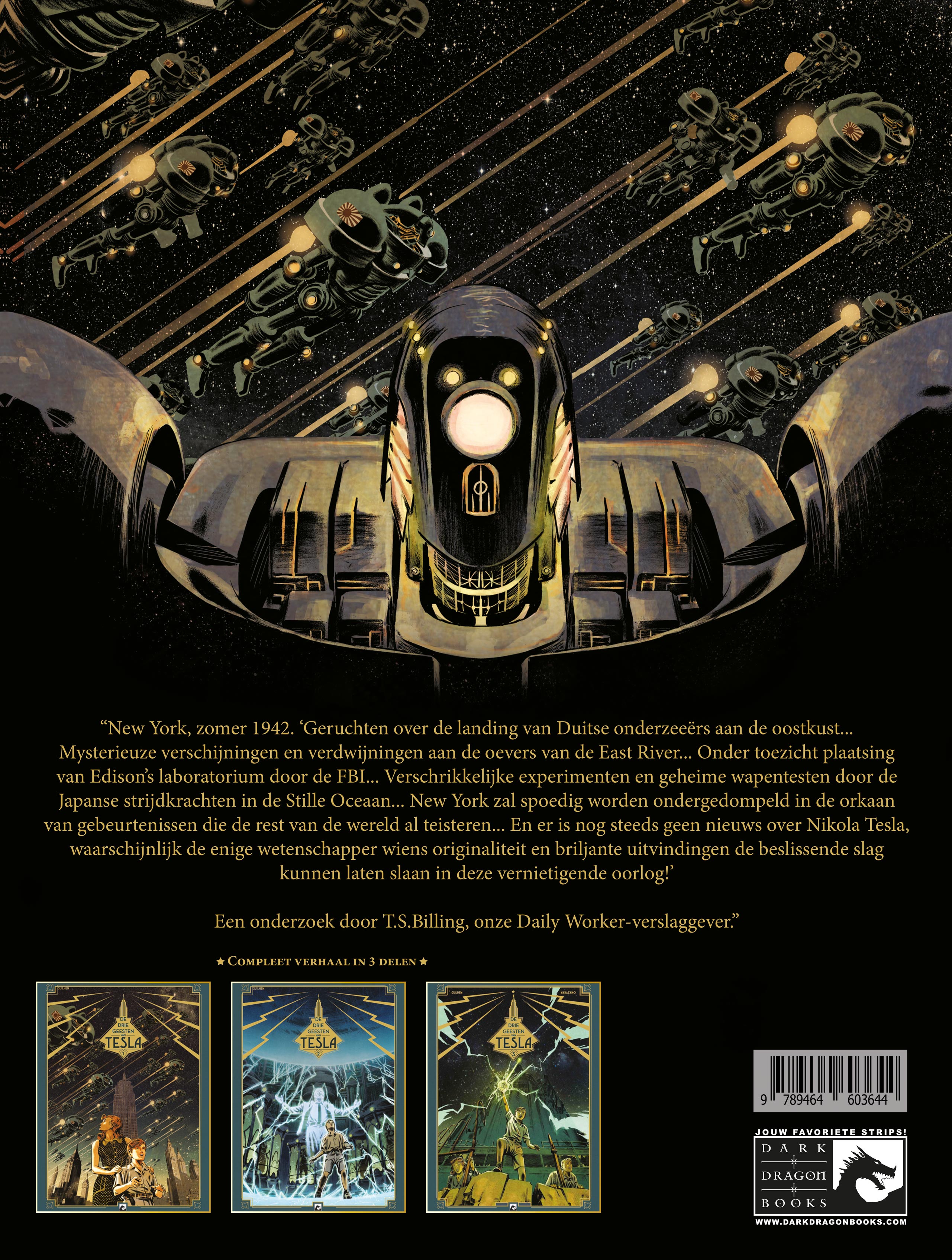 compleet verhaal in 3 delen New York, zomer 1942. “Geruchten over de landing van Duitse onderzeeërs aan de oostkust... Mysterieuze verschijningen en verdwijningen aan de oevers van de East River... Onder toezicht plaatsing van Edison’s laboratorium door de FBI... Verschrikkelijke experimenten en geheime wapentesten door de Japanse strijdkrachten in de Stille Oceaan... New York zal spoedig worden ondergedompeld in de orkaan van gebeurtenissen die de rest van de wereld al teisteren... En er is nog steeds geen nieuws over Nikola Tesla, waarschijnlijk de enige wetenschapper wiens originaliteit en briljante uitvindingen de beslissende slag kunnen laten slaan in deze vernietigende oorlog! ” Een onderzoek door T.S.Billing, onze Daily Worker-verslaggever.