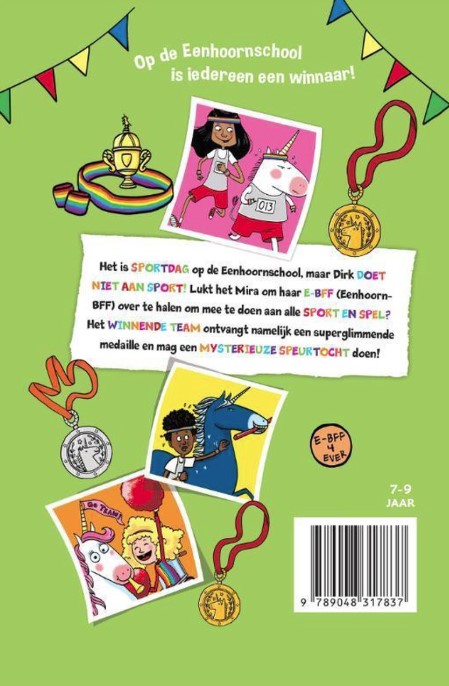 Het is sportdag op de Eenhoornschool, maar Mira’s eenhoorn Dirk doet NIET aan sport. Kan Mira haar E-BFF (Eenhoorn Best Friend Forever) overtuigen mee te doen aan de wedstrijden en spelletjes? De prijs voor het winnende team is een medaille én een Magische Regenboogtocht, dus Mira zet alles op alles om te winnen. Als dat maar goed gaat... - Het tweede deel in de grappigste eenhoornserie! - Met geweldige illustraties van David O’Connell, en een gouden omslag. - Een eenhoornverhaal zonder over-daad aan roze en glitters.