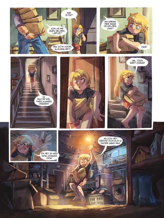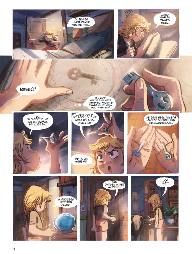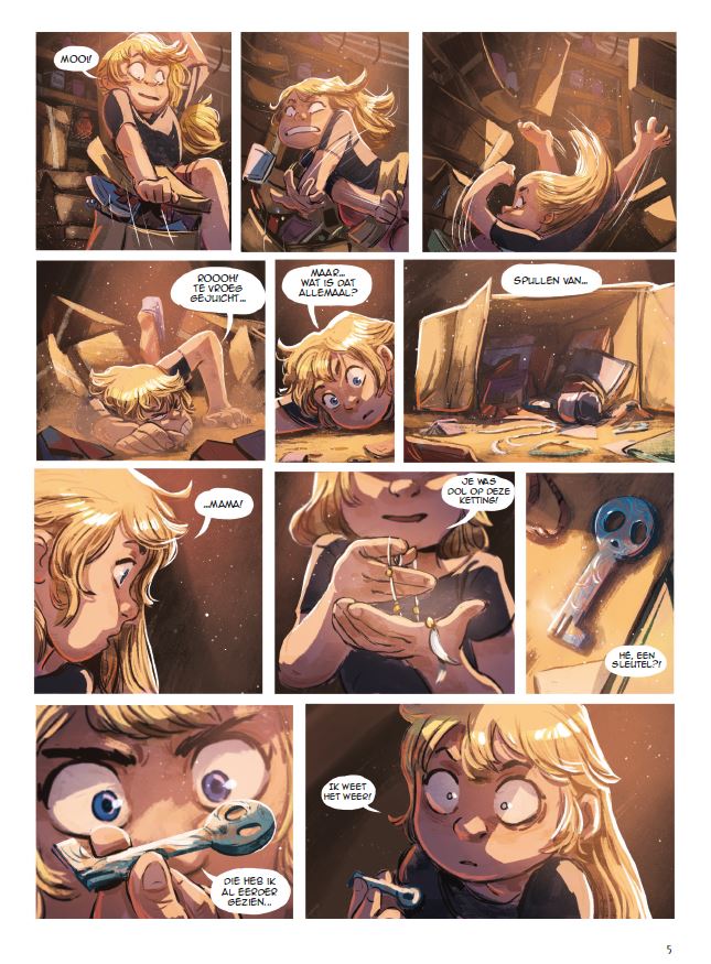 Gemiddelde score 4 / 5Dit mooi geïllustreerde stripverhaal laat je kennismaken met Nola, een blond meisje die haar mama heel hard mist omdat ze gestorven is. Ze bekijkt oude foto’s van haar mama en helpt nadien haar papa met het opruimen van enkele dozen die ze naar de kelder moet brengen. Hierbij vindt ze een vreemde sleutel. Ze herkent de sleutel van op een tekening, maar weet niet op welk slot hij past. Ze besluit de hulp in te roepen van de Pandorianen, een volk dat leeft in een andere, magische wereld. Hiervoor heeft ze camouflagepoeder nodig waardoor ze niet opvalt en ook op een Pandoriaan lijkt. Daar besluiten Igor en Andrea haar te helpen. In Pandoria leven er ook nog andere vreemde wezens, zoals de Octopoot die gearresteerd werd door de KBH. Op hun zoektocht komen ze ook nog Willow tegen die op haar juf Muzonologie wacht, maar ze ontdekken al snel dat deze op een geheimzinnige manier verdwenen is. Nola, Igor en Adrea besluiten om er het fijne van te weten en gaan op onderzoek uit. Wie op zoek is naar een spannend avontuur, zit met dit stripverhaal op z’n plaats. Doordat je samen met Nola en haar vrienden op avontuur gaat, lijkt het alsof je de avonturen zelf meemaakt. Je komt telkens een stapje dichter bij de ontknoping. Het scenario is dan ook zeer vlot geschreven. Qua illustraties laat het stripverhaal je al kennis maken met de prachtige tekenstijl door de kaft. Je ziet een gedetailleerde tekening van Nola die zeer vastberaden en onverschrokken is. Rond Nola is een mooie bloemenboog gemaakt met prachtige, kleurrijke bloemen en planten. Knap gedaan van de illustrator, want zo lijkt het alsof je een kijkje kan nemen in het verhaal. Gijé, de jonge Congolese illustrator van dit stripverhaal, geeft je zo al een inkijk in hoe de sfeer en de rest van de illustraties zal zijn. Hij werkt afwisselend met licht en donker. Nola en haar vrienden, normaal uitziende ‘mensen’ worden met heldere, lichtere kleuren getekend. De vreemde, fantasieachtige en engere wezens worden donkerder afgebeeld. Carbone, de auteur van dit magnifieke beeldverhaal, kan actuele thema’s op een fantasievolle manier aanbrengen. Dit stripverhaal is dan ook een combinatie van realistische elementen verweven met surreële, ietwat absurde aspecten. Ze neemt je mee in een betoverende wereld. Dit deel is het vierde deel in de reeks van De Muziekdoos. Je kan elk deel afzonderlijk lezen, waarin Nola wel telkens de hoofdrol speelt en allerlei magische avonturen meemaakt. In de vorige delen krijg je telkens wat meer info over de muziekdoos en de magische wereld van Pandoria. De delen zijn dus chronologisch opgebouwd. Een zeer leuke en magische stripreeks voor kinderen vanaf 8 jaar.