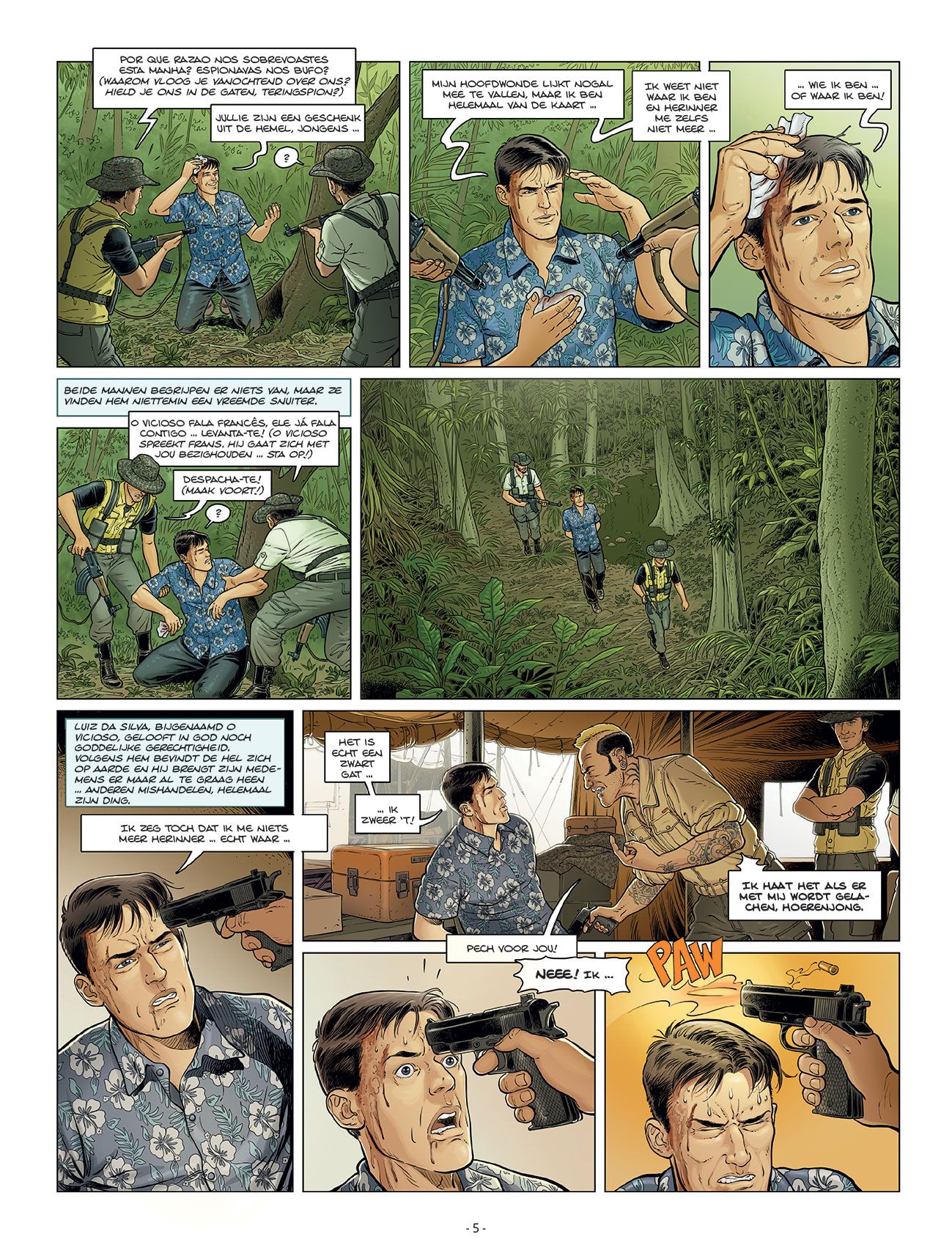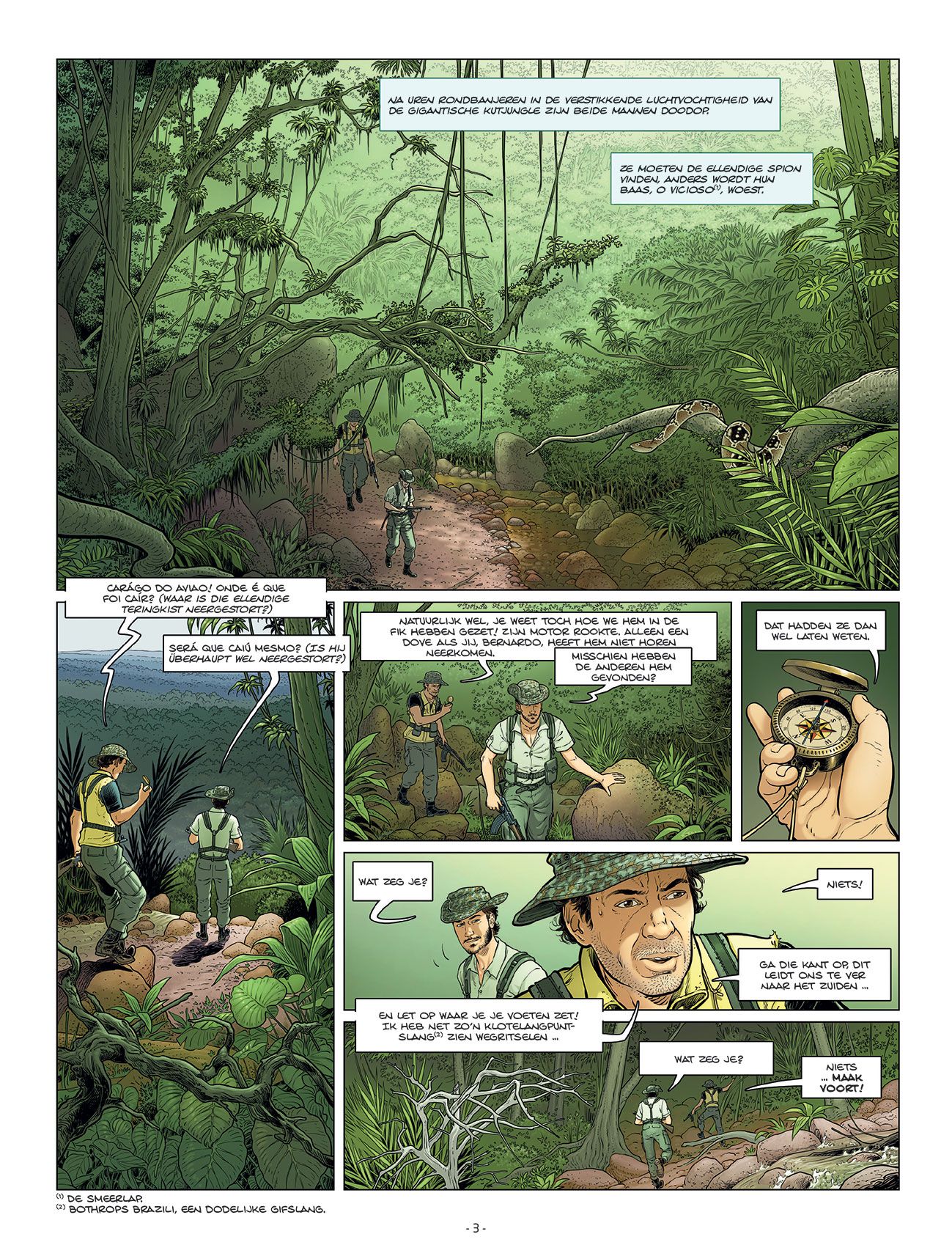 Gemiddelde score 4 / 5Watervliegtuig op kabbelende Amazone Jean-Charles Kraehns Gil St. André draait intussen al eventjes mee. In zijn beginjaren, toen de reeks nog Spoorloos heette en Gil nog op zoek was naar zijn verdwenen vrouw, kon hij naar onze bescheiden mening zijn voet nagenoeg naast die van Largo Winch zetten. Gil was een soort Largo zonder jetsetallures, een welstellend man zonder posterboy-voorkomen. Gil is als een Largo van wie de prioriteiten anders liggen. Hij is geloofwaardiger, menselijker, onder meer door zijn vaderschap. Wel valt op hoezeer het avontuur hem sinds het einde van de tweede cyclus, steeds maar weer lijkt te overkomen, alsof scenarist Jean-Charles Kraehn nog eens extra wil benadrukken dat Gil eigenlijk een gewone familieman is die eigenlijk niks liever wil dan simpelweg met rust gelaten worden. Ook nu vallen de moeilijkheden Gil zomaar op de nek. Hij is op vakantie en wil van de gelegenheid gebruikmaken om even snel een vriend te gaan bezoeken aan de rand van het Amazonegebied. Zonder het te beseffen haalt hij zich problemen op de hals. Wat volgt is een onderhoudende thriller. Kraehn is als ervaren rot meer dan onderlegd in dit genre. Hij heeft minder stokpaardjes en hanteert minder trucjes dan bijvoorbeeld Jean Van Hamme en heeft meer oog voor de psyche van zijn personage dan een Stephen Desberg en toch heeft hij zijn heel eigen stijl. Niettemin dit verhaal onderhoudend is, moeten we toch vaststellen dat dit plot hier en daar wat kabbelt, en iets te veel vertrouwt op een (degelijke) automatische piloot. Een beetje jammer toch. De kracht en het potentieel van het personage uit de eerste twee cycli is zeker nog aanwezig en voelbaar, hij lijkt alleen een beetje ingedommeld. Ligt het misschien aan het wat stilgevallen verschijningsritme, waardoor we wat voeling verloren met het personage? We zullen het hopelijk gauw zien, in het Frans verscheen het volgende deel inmiddels al. Kraehn schrijft ook zoveel. De prima nieuwe avonturen van Roodbaard zijn van zijn hand en nu hij met Roberto Zaghi (bekend van Thomas Silane) vervanging heeft gevonden voor de veel te vroeg overleden Patrick Jusseaume lijkt ook Tramp weldra een doorstart te gaan maken. De nochtans puike Tramp-spin-off De Vliegenier werd na drie delen stopgezet. Kraehn heeft echter goed beseft dat hij tekenaar Chrys Millien best aan boord kon houden en dus verkaste Milien na deel 11 naar deze reeks. Zo is hij de derde tekenaar — na Kraehn, Sylvain Vallée en nog eens Kraehn zelf — die Gil gestalte geeft. Dat doet hij nauwgezet en op het niveau van de rest van de reeks. Hij inkt lichter dan zijn voorgangers — misschien veeleer een uiting van een grafische tijdsgeest? — maar het past bij de reeks. Sowieso hadden Kraehn en Millien met De Vliegenier al bewezen een prima duo te zijn. Wat ons betreft mag deze tandem nog een tijdje blijven doorfietsen... bron ssz