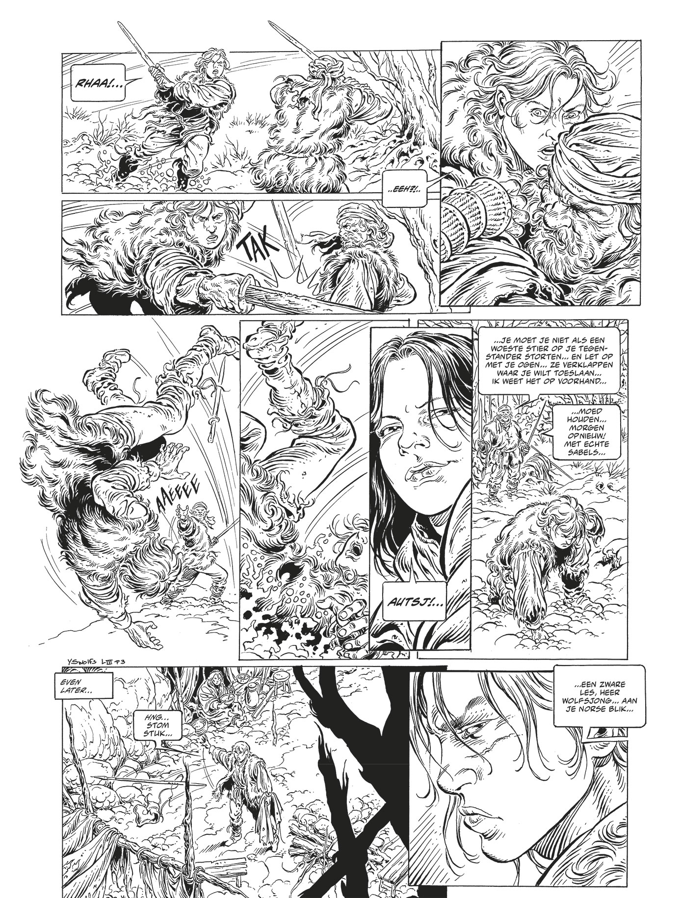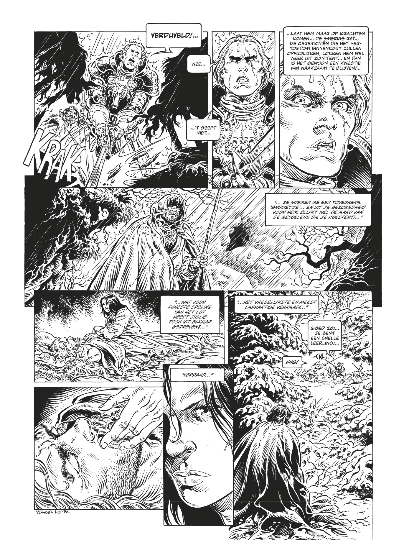 Bruinetje waakt over Tristan, die er erg aan toe is. Ze vertelt aan Edwene over hun band, en over hoe ze gescheiden zijn geraakt: hertog Matthias de Dorre had een klopjacht georganiseerd om de keelsnijders op te sporen en de gezant van de Franse koning te bevrijden die zij gevangenhielden. Dat hij zo ook Tristan kon opsporen, motiveerde hem alleen nog meer. Laatste deel van de eerste cyclus van Legende, een schitterende reeks van Yves Swolfs - barstensvol avontuur en meesterlijke tekeningen Bewonder de lijnvoering van Yves Swolfs in deze exclusieve zwart-wituitgave