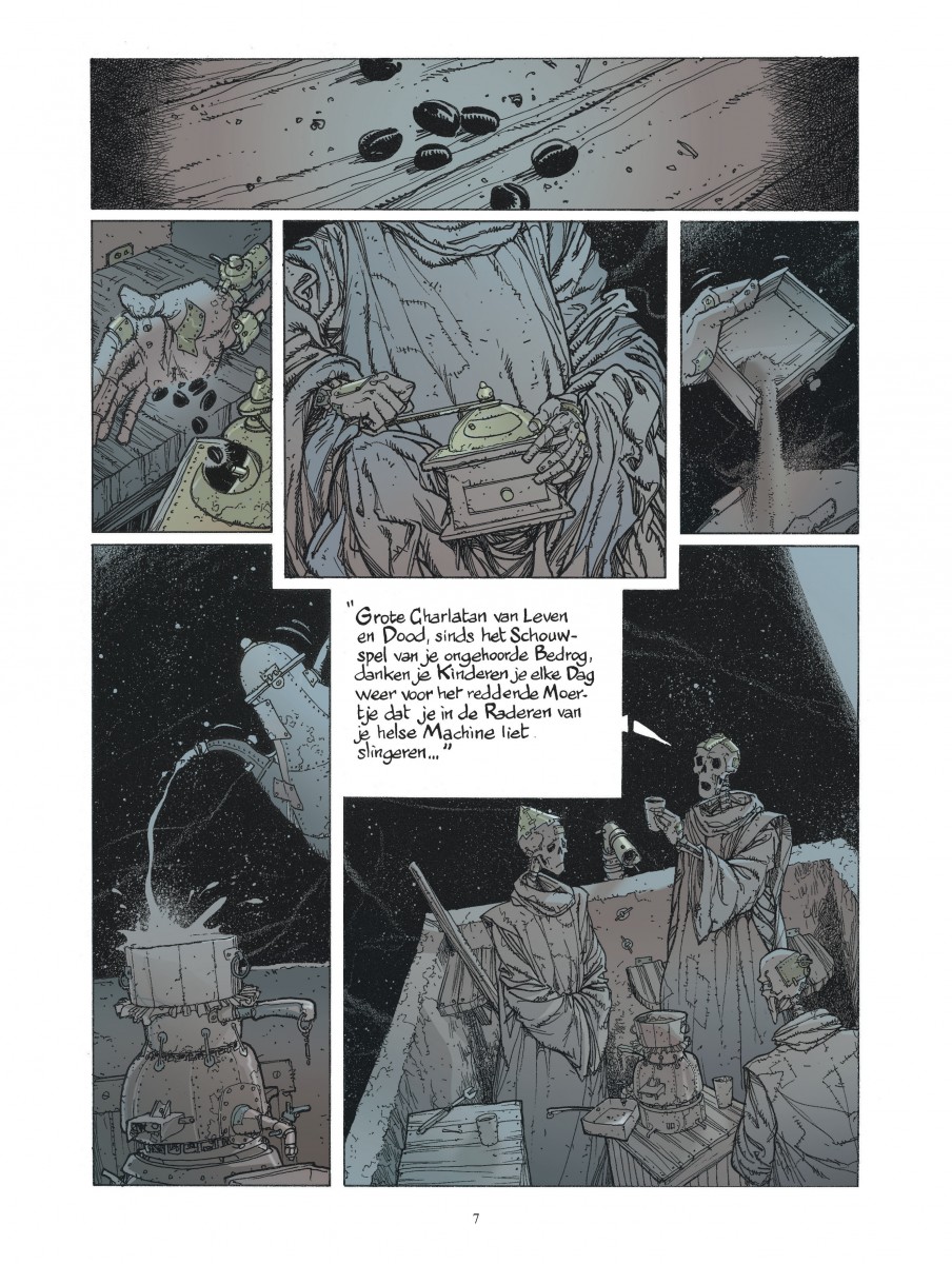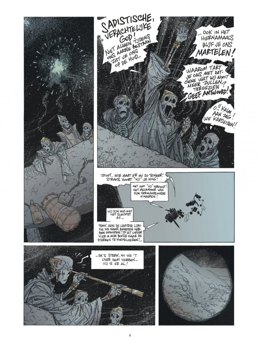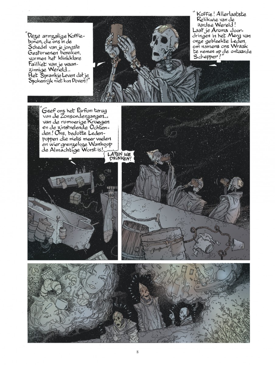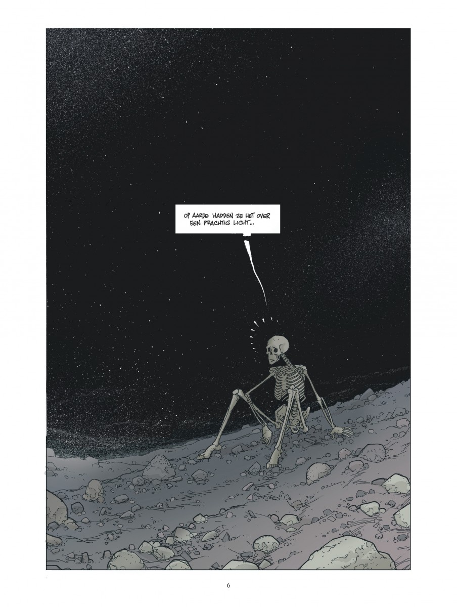 In de nacht van 11 op 12 februari 1997, exact om middernacht, glijdt de cartograaf Victor Tortelduif uit over een speelgoedautootje dat zijn zoontje op de badkamervloer heeft laten liggen. Hij belandt aan gene zijde, in het knekelhuis des hemels onder een gitzwart firmament. Er is niets te horen en geen ziel te bekennen. Maar Victor past zich aan. Hij is blij nog bij volle bewustzijn te zijn en hij is zelfs nog helderder van geest dan voorheen op aarde, al resten hem van zijn lichaam enkel nog de botten. Victor is zwaar ontgoocheld, maar beseft nog niet dat hij straks het meest waanzinnige avontuur zal beleven dat een dode ooit is overkomen. Integrale bundeling van deze even bevreemdende als fantastische reeks van Eric Liberge (De kapers van Alcibiades, Reiziger).