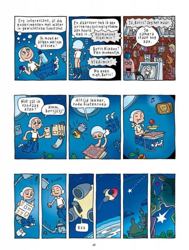 Zelfs zijn koffiezetapparaat, radio en avocadoplantje mogen mee. Voorbeeldig als altijd werkt hij de vele experimenten af. Juffrouw Monaco bevoorraadt onze kosmonaut Vladimir om de twee maanden. Deze 'bijzondere verschijning' maakt dat onze ruimtereiziger 'alleen zijn' plots toch niet meer zo tof vindt. De liefde, de grootste kracht in het universum, weet je wel! Maar juist dan krijgt hij technische problemen en een noodlanding volgt. Vladimir komt op een erg afgelegen boerderij terecht en leert er de stiel van een vriendelijke dame. Hij waardeert het land, de dieren en de vruchten, maar de liefde blijft in zijn gedachten. Zou Monaco ook af en toe aan hem denken?