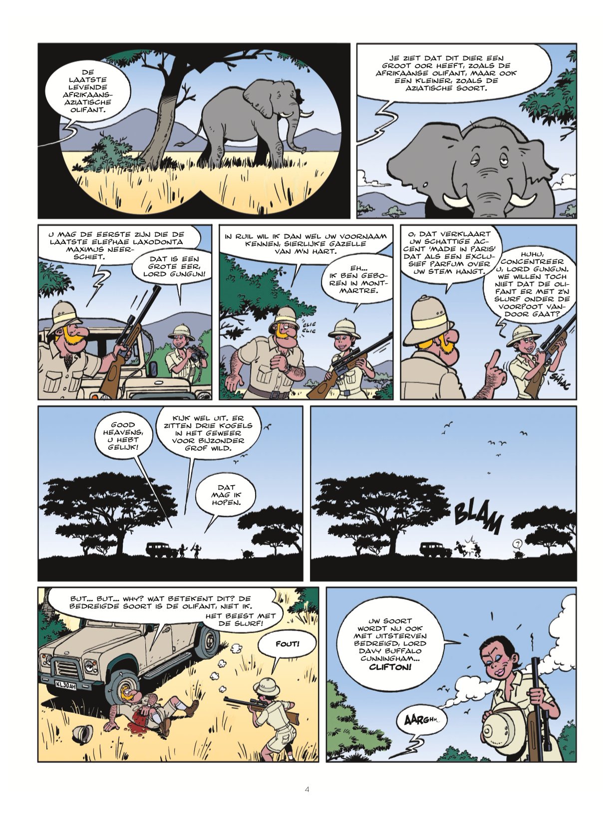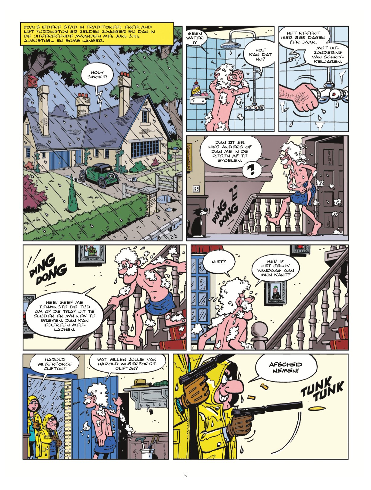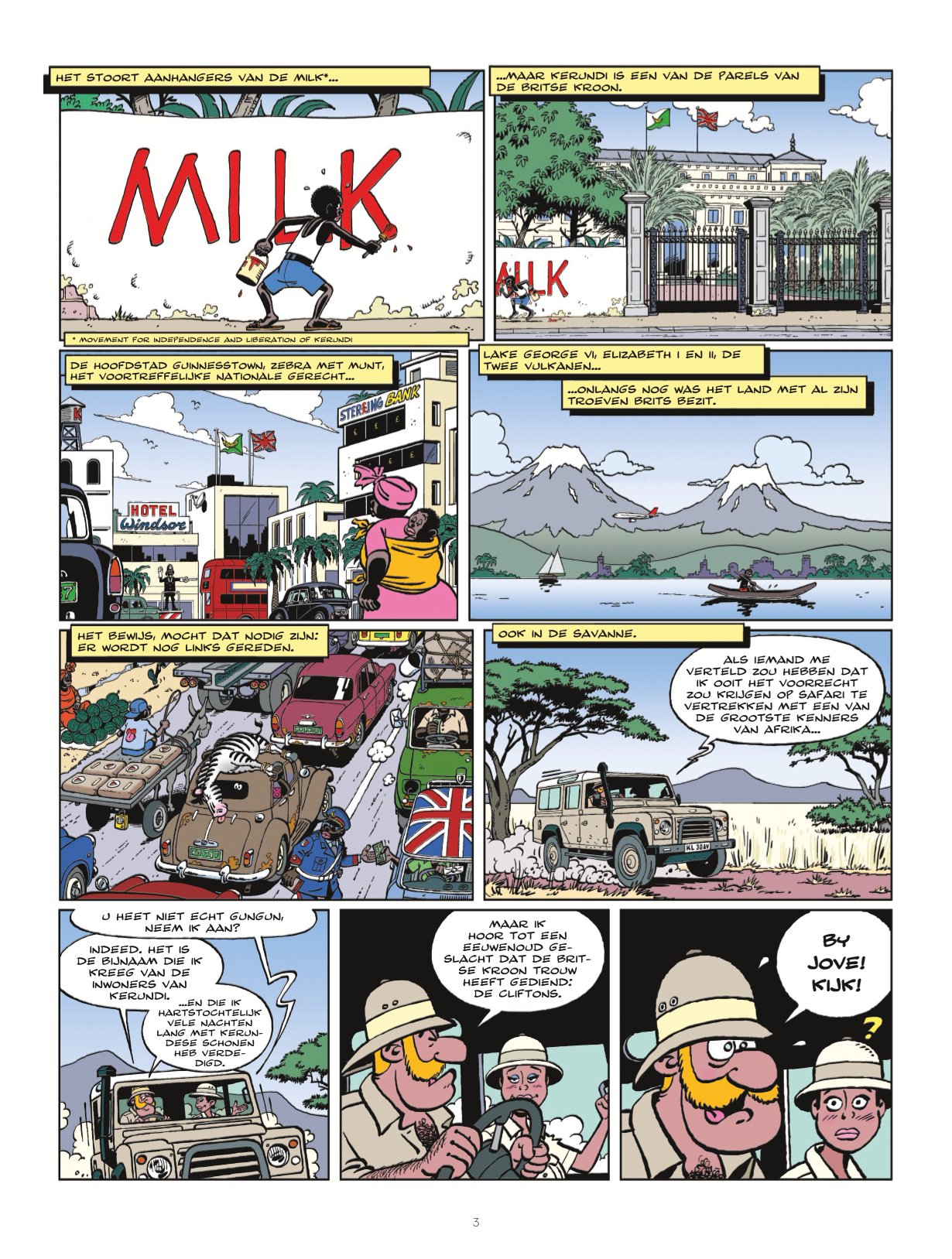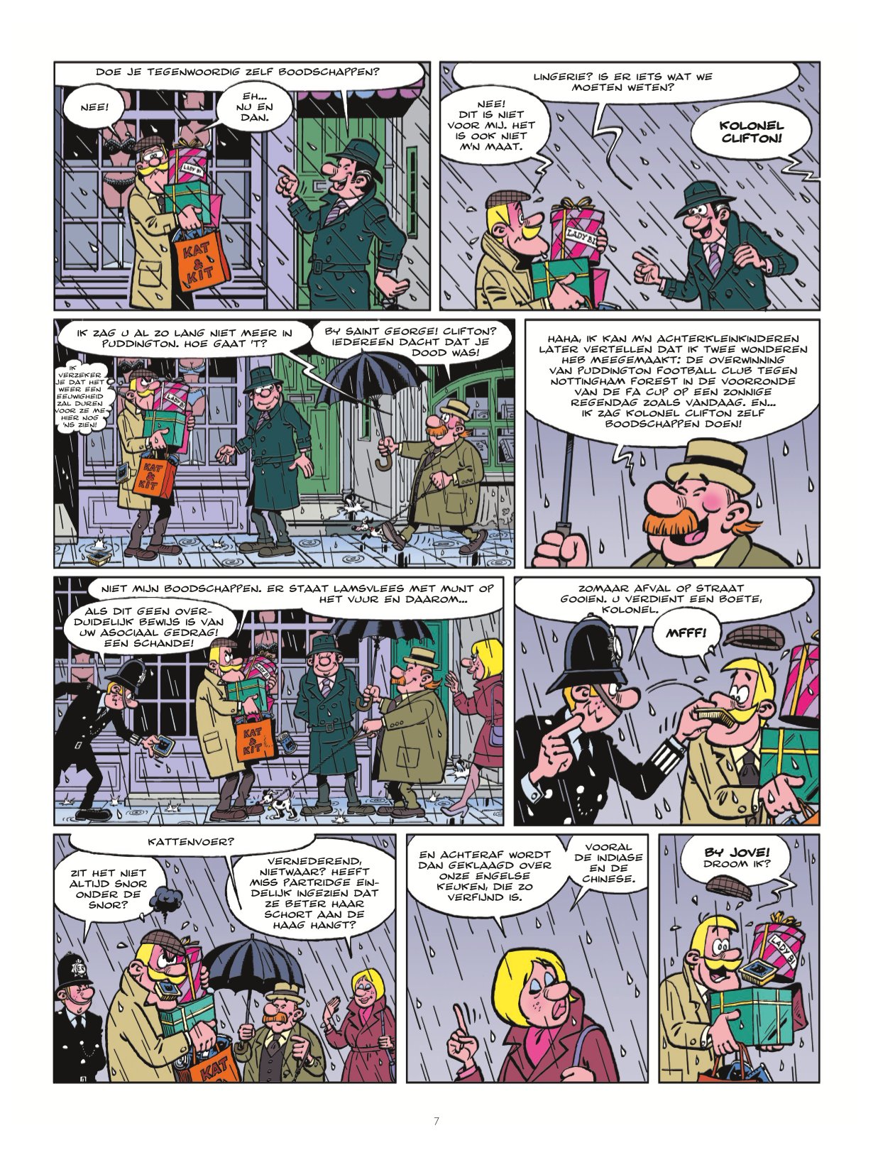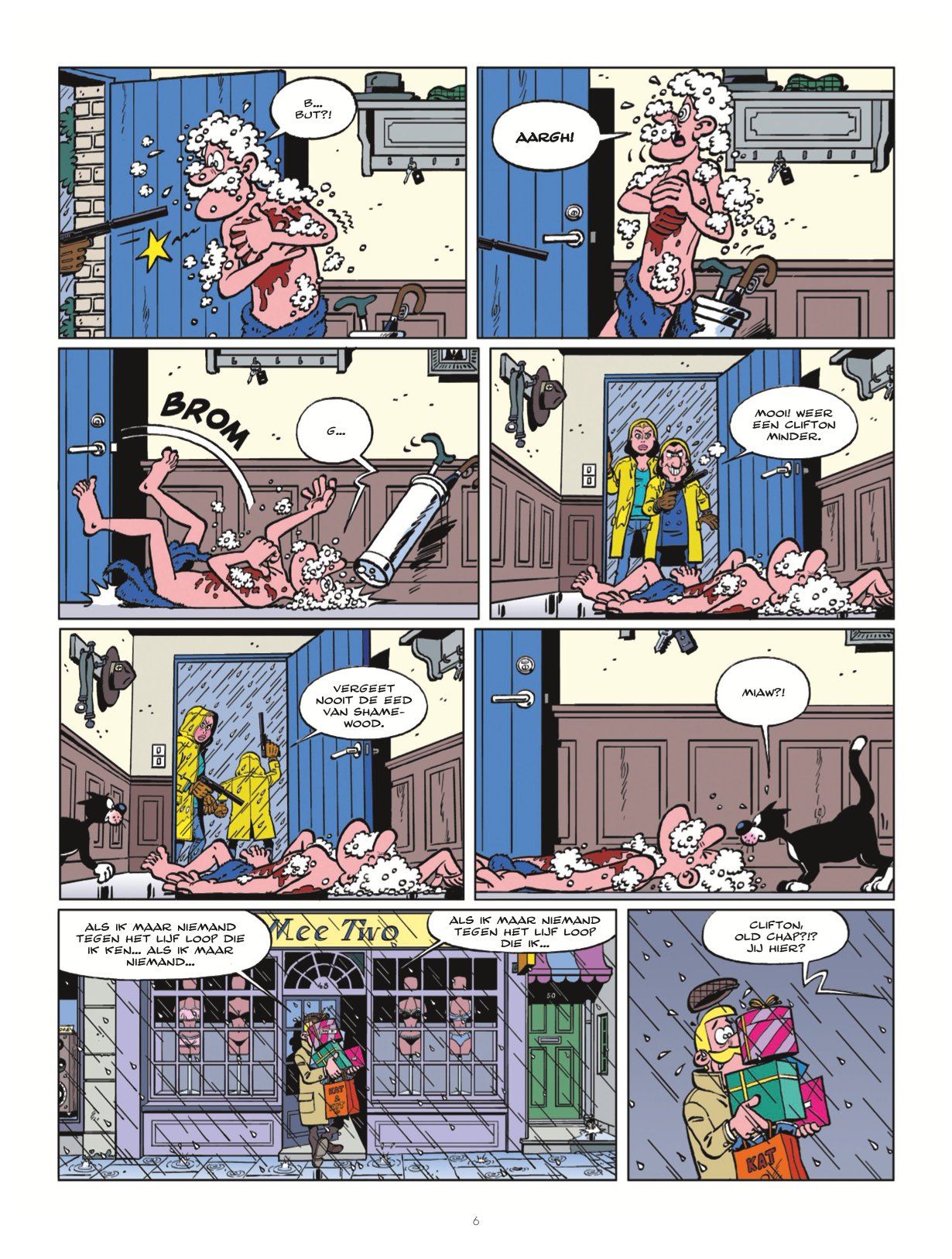 Gemiddelde score 4 / 5Derde keer, goede keer? Scenarist Zidrou (De Adoptie, Shi, Rik Ringers) begint zich al goed thuis te voelen met deze nieuwe avonturen van Clifton. Na Spookrijders onder Invloed en Just Married is dit toch al het derde album. Maar Turk (76) vindt het nu alvast welletjes. Hij heeft werk genoeg met Leonardo, tegenwoordig ook al op scenario van Zidrou. Op Bob de Groot (82) zal hij helaas niet meer kunnen rekenen. Onze deelneming trouwens. Lees hier het ruime overzicht van zijn carrière. Het eeuwenoud geslacht dat de Britse kroon trouw heeft gediend — de Cliftons — komt in gevaar. Lord Davy Buffalo Cunningham Clifton wordt alvast definitief uitgeschakeld. Met de vader van Clifton gaat het al niet veel beter. En als je moet rekenen op de gezondheidszorg in het Verenigd Koninkrijk... De eed van Shamewood zal nog een belangrijke rol spelen! Na het verdwijnen van de laatste mannelijke Clifton zal het graafschap Puddington immers Frans bezit worden. Maar Clifton zweert: Zolang ik leef, wordt Puddington geen tweedehands Monaco." Miss Pamela Partridge heeft niet voor de Brexit gestemd om deze schande mee te moeten maken. Ondanks tweedegraadsbrandwonden aan haar beide handen speelt ze een voorname rol in dit avontuur. Net zoals in het laatste album van de Kiekeboes, Seizoensfinale, worden heel wat oude bekenden opgevoerd. Alvast veel plezier met het opzoeken van de juiste albums met deze personages: Miss Agatha (wat een tip!) Spinsterhood Leila (zo'n secretaresse willen wij ook) Jason (met hem in de achtervolging staat Napoleon XI er niet goed op) Oliver (die weet dan toch iets goeds te zeggen over Frankrijk) Best een spannend verhaal, deze De Laatste Clifton, en wat een mooi eerbetoon aan de oorspronkelijke bedenker Raymond Macherot als standbeeld op pagina 44. Hopen we toch alweer op een nieuw album? En wie zal dat dan tekenen? ssz bron"
