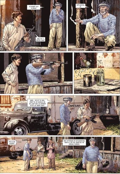 Gemiddelde score 3 / 5Een harde strijd Het verhaal begint in september 2001 en toont hoe in een verre republiek van de Sovjet-Unie, tegen de grens met Afghanistan, een zekere Nikolaï samen met enkele arbeiders een vrachtwagen uitlaadt. Een draagbaar radiootje vermeldt plots de dood van rebellenleider Massoud bij een zelfmoordaanslag. Een minachtende opmerking van een arbeider over die “bruinjoekel” doet Nikolaï ontvlammen en hij gaat die man te lijf. Collega’s kunnen hem nog tijdig overmeesteren. Nikolaï vertelt dan dat hij de lijfwacht was van Massoud en hij voelt zich schuldig niet bij hem te zijn geweest om de aanslag te voorkomen. Blijkt dat Nikolaï Bystrov begin jaren 1980 als jonge soldaat van de Sovjet-Unie, tijdens de expansiedrang van het Kremlin, is gaan vechten in Afghanistan. Hij bleek een goede scherpschutter. Tijdens een missie valt de patrouille met Nikolaï in een hinderlaag en ze worden gevangen genomen door Afghaanse rebellen, waarna ze in handen komen van Massoud. Het is een periode dat de rebellen niet alleen tegen de Sovjet-Unie vechten, maar dat Afghaanse clans elkaar ook onderling bestrijden. Tijdens zijn gevangenschap bij Massoud kan Nikolaï verschillende malen een hinderlaag afweren en zo het leven van Massoud redden, die hem erkentelijk is en hem vrijlaat. Uit eigen beweging blijft Nikolaï bij de clan van Massoud, wordt zijn persoonlijke lijfwacht en hij voelt zich ook meer en meer thuis in Afghanistan. Hij wordt zelfs moslim en trouwt met een Afghaanse vrouw. Zij wordt zwanger en wil de bevalling in de beste omstandigheden laten verlopen in de Sovjet-Unie. Maar de terugkeer naar Afghanistan wordt niet gemakkelijk voor een Rus. Het album is getekend door de Braziliaan Renato Arlem (Superman) met inkleuring van zijn landgenoot Thiago Rocha op scenario van de Fransman Jean-Pierre Pécau (Frontlinies, Man van het Jaar, Uur U, Wonderball, War Machines,...). Pécau is heel productief en vindt als historicus duidelijk zijn draai in albums met een historische achtergrond. De tekenstijl van Arlem is bijzonder gedetailleerd, haast fotografisch te noemen, met knappe bergtaferelen en een passende inkleuring van Rocha. De naam van commandant Massoud zal bij de meesten misschien een belletje doen rinkelen, ook al is hij meer dan twintig jaar dood en is de oorlog in Afghanistan theoretisch afgelopen. Maar de tienjarige inval die de Sovjet-Unie begin jaren 1980 is begonnen tegen de Afghaanse rebellen of islamitische verzetsstrijders (moedjahedien) om een communistische regering aan de macht te helpen, blijft nog in het geheugen sluimeren (zie ook de harde film Beast of War). Vooral de naam Massoud die verschillende aanvallen van het Sovjetleger in de Panjshir-vallei wist af te slaan, blijft daarbij hangen. Hij werd als een held beschouwd voor zijn verzet tegen de invaller en kreeg de bijnaam “Leeuw van Panjshir”. Het is ook die positieve reputatie en de geschiedkundige achtergrond van Afghanistan die me heeft aangetrokken dit album aan te schaffen. Jammer genoeg werd Massoud in 2001 gedood bij een zelfmoordaanslag door Al-Qaida — enkele dagen voor 9/11 — en is Afghanistan langzamerhand, ook na latere tussenkomsten van de VS, helemaal in handen gevallen van de fundamentalistische Taliban. Democratie en vrouwenrechten zijn er momenteel nog ver af. Een interessant en spannend album met achterin een beknopt geschiedkundig dossier waarin ook enkele foto’s van de nog levende Sovjetsoldaat Nikolaï Bystrov.