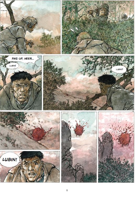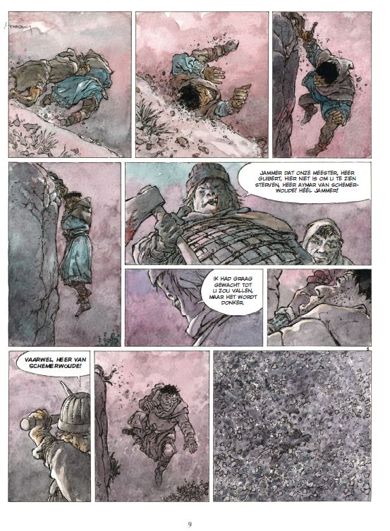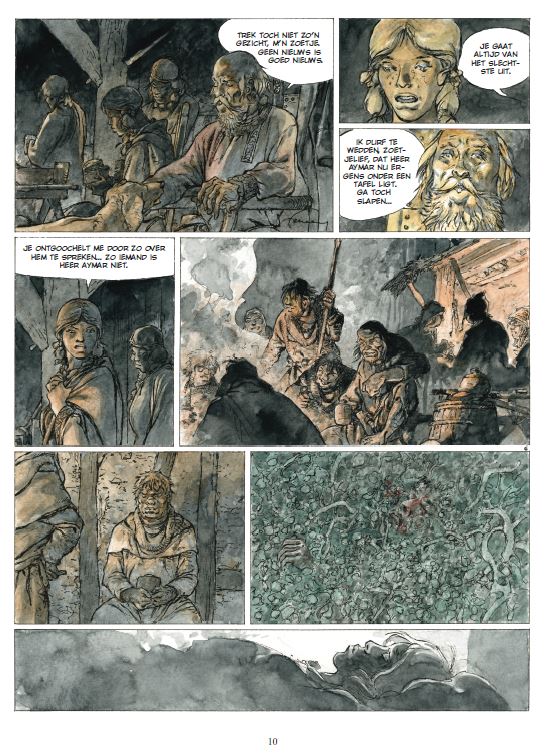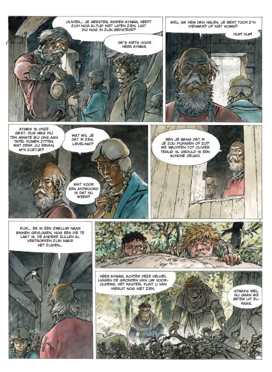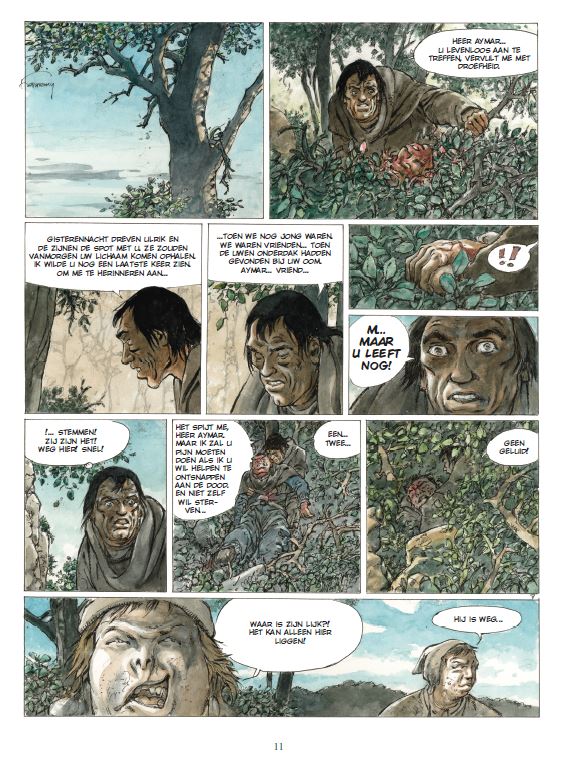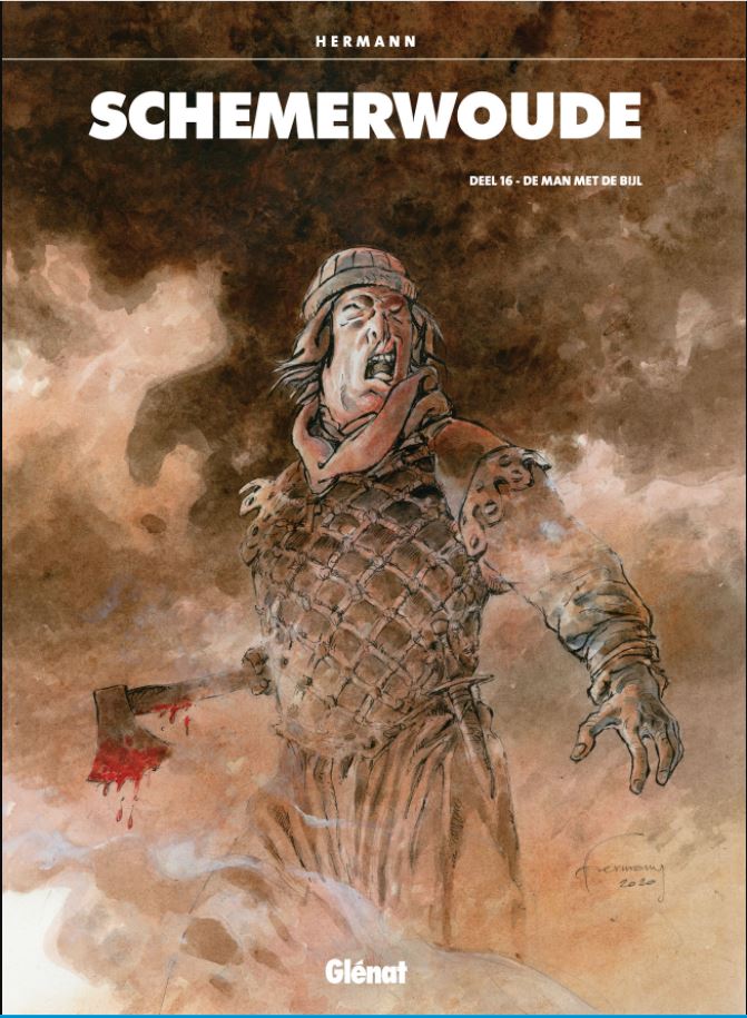 Gemiddelde score 3 / 5We hadden niet verwacht dat we nog een nieuw album van Schemerwoude zouden mogen lezen. Met name de eerste tien delen behoren terecht tot de hoofdklasse van ridderstrips en het dramatische einde van het laatste deel was een sterk afscheid wat zeker bijdroeg aan de klassiekersstatus van de dolende ridder Aymar. De vijf daaropvolgende albums gingen over nazaten van Aymar die in verschillende tijdperken leefden. Zoals wel vaker werkte Hermann dan samen met zijn zoon Yves die het scenario verzorgde. Hermann raakt op leeftijd en Schemerwoude leek te zijn veroordeeld tot een strip uit het verleden die steeds meer uit beeld raakte. Toen ons het nieuws bereikte dat Hermann werkte aan een nieuwe strip over Aymar waren we benieuwd naar het resultaat. Dat hij jarenlang deel uitmaakte van de absolute tekenaarstop is een feit, maar de tand des tijds zorgde wel voor afname in de kwaliteit van zijn verhalen. Zowel grafisch maar ook qua verhaal heeft Hermann al jarenlang geen klassiekers meer geproduceerd. En na het lezen van deze waarschijnlijk laatste Schemerwoude wordt onze mening hierin bevestigd. Ridder Aymar is te gast op het land van heer Baudran en waagt zich op zijn verloren land. Al snel wordt hij verrast en de slechterik Ulrik verwondt hem. Het kost enige tijd om te herstellen van zijn verwondingen en dan besluit Aymar de dorpsbewoners te helpen in hun strijd tegen de landheer en diens brute krijger. Chronologisch speelt dit verhaal zich af aan het begin van de reeks en het kan prima worden gelezen zonder alle voorgaande albums eerst te moeten herlezen. Het verhaal bevat bekende Hermann-ingrediënten, zoals wraak, onrecht en onderdrukte vrouwen, en er zijn legio recente Jeremiah-albums met een dunnere verhaallijn. Grafisch zijn we een stuk minder onder de indruk. En het lijkt er volgens ons nu toch echt op dat het grafische verval van de oude meester is ingezet. Een jammerlijke constatering, want een Hermann op zijn hoogtepunt was van een zeldzaam hoog niveau. (SSZ)
