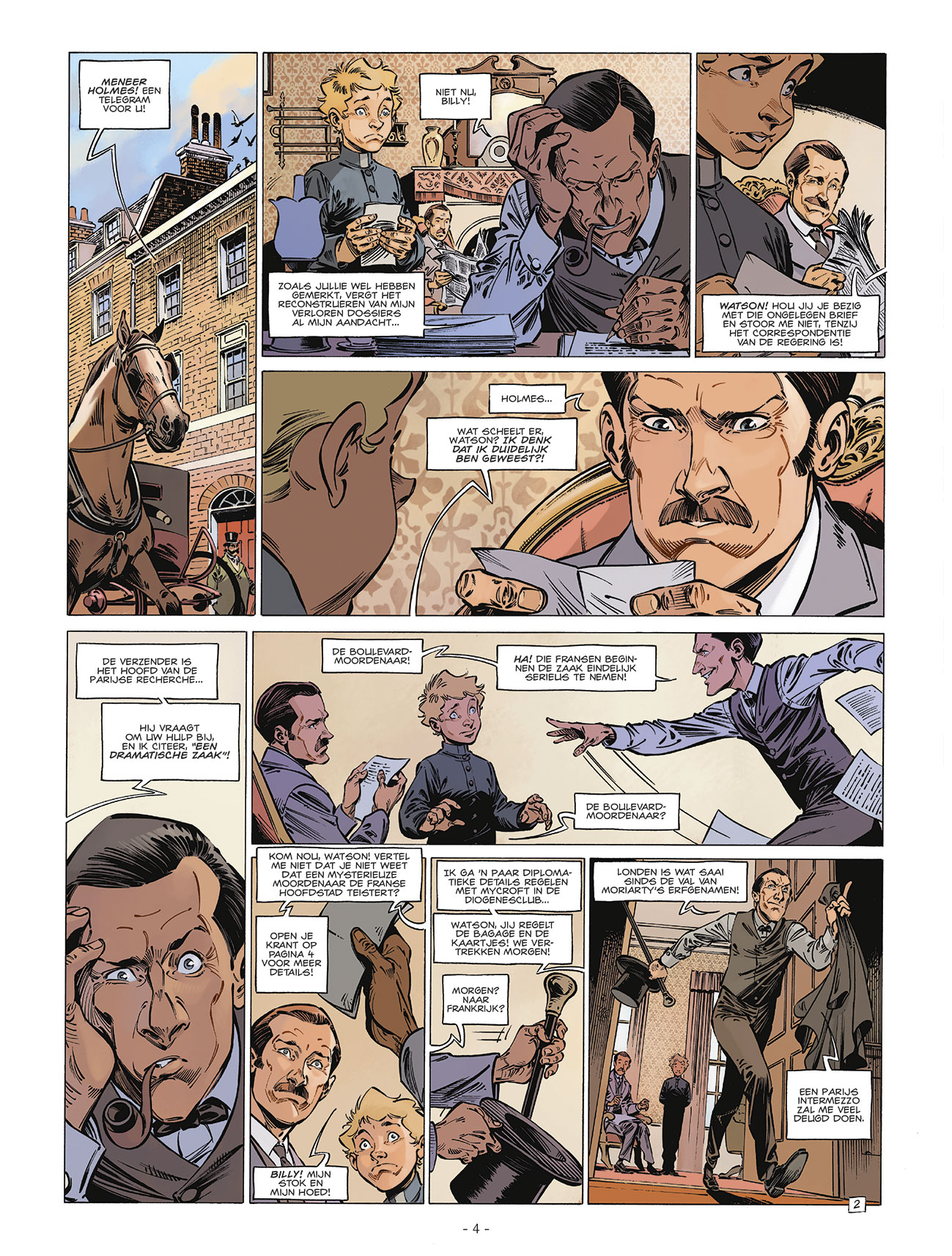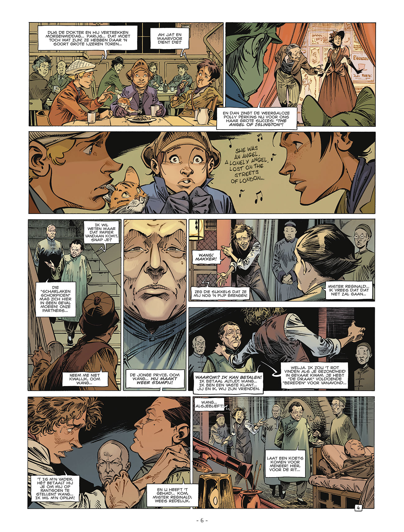 1895. De spanning stijgt op de Londense dokken ... Aan de ene kant de wet van stilte van oom Wang en zijn handlangers, die met een ijzeren vuist regeren over Chinatown. Anderzijds, het blinde geweld van de Mad Dogs, overvallers van cockneys, vastbesloten om hun mysterieus vermoorde leider te wreken. Billy, Charlie en Black Tom, belast door Sherlock Holmes om deze explosieve situatie in de gaten te houden, worden samen met de trouwe kater Watson gevangen tussen de hamer en het aambeeld ... Wie zal het opnemen tegen de Masters of Limehouse? Wie verbergt zich achter het teken van Scorpion Scarlet? En wie wordt het volgende slachtoffer? Gelegen in het hart van Limehouse, de 'Chinatown' van Londen, dompelt dit nieuwe onderzoek van de Four of Baker Street ons onder in een nieuwe wereld waar de misdaad exotischer maar niet minder formidabel is. Een nieuw avontuur vol actie, mysterie en emotie! David Etien is een Franse Striptekenaar geboren in 1981 en tekent momenteel deze reeksen: De vier van Bakerstreet a href='/R-stripverhalen-op-zoek-naar-de-tijdvogel-bestellen.asp'> Op Zoek naar de tijdvogel Rommelgem Chito Grant Djian Jean-Blaise ( Frankrijk, °1953) kennen we ook als de stripscenarist van volgende stripreeksen : Normandie 44 Milana en Arlof Middernacht Liberty Bessy Julia Von Kleist Fatal Jack De Vier van Baker Street De Minderbroederschool AANRADER > De Kampioenen van Albion De Grote Dode