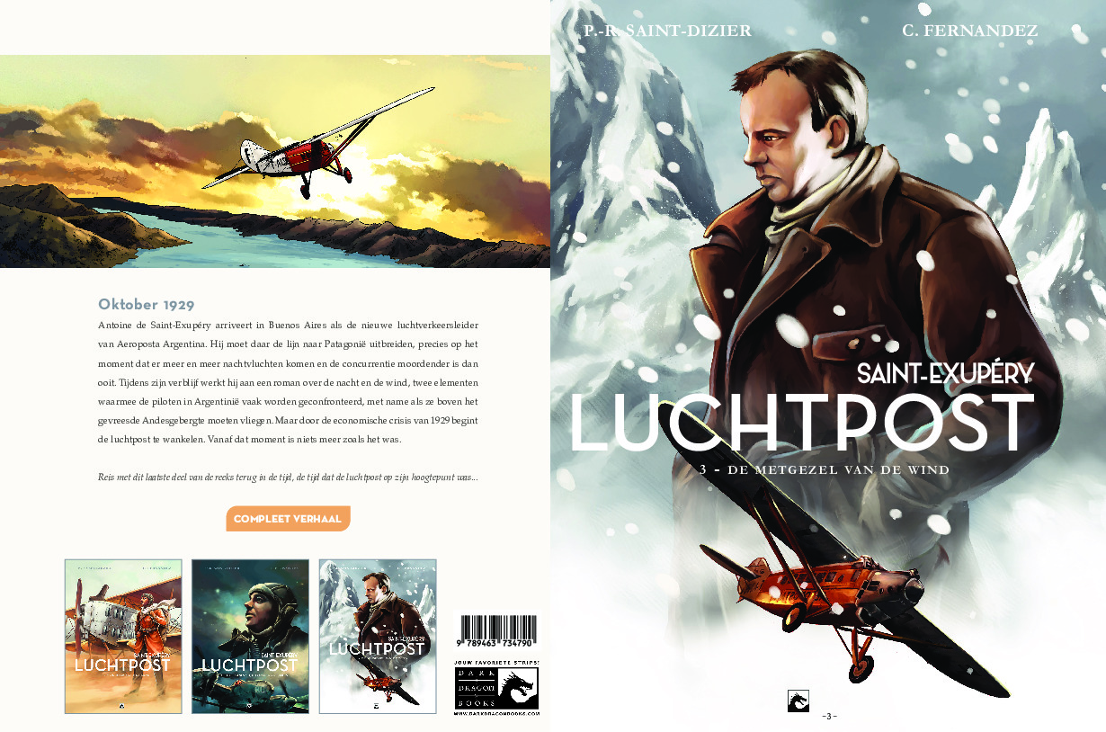Het grote avontuur van de pioniers van de luchtvaart. Deze avonturier Antoine Saint-Exupéry is de schrijver van 'De kleine prins' dat geldt als een van de beste, en het vaakst vertaalde boek uit de Franse literatuur. In een subtiel fictieverhaal, geïnspireerd door waargebeurde feiten, vertellen Pierre-Roland Saint-Dizier en Cédric Fernandez de historie van de Aéropostale door de ogen van de mensen die er werkten, vaak met gevaar voor hun eigen leven. INHOUD: Tijdens de vlucht is de wind je bondgenoot ... of je ergste vijand. Oktober 1929. Antoine de Saint-Exupéry, benoemd tot hoofd van het verkeer voor Aeroposta Argentinië, arriveert in Buenos-Aires. Zijn missie is om de lijn uit te breiden naar Patagonië, net op het moment dat nachtvluchten steeds meer gegeneraliseerd worden en de concurrentie sterker wordt. Tijdens zijn verblijf werkt hij aan een roman over de nacht en de wind, twee elementen waarmee de vliegers in Argentinië vaak worden geconfronteerd, vooral als het gaat om het vliegen over de formidabele Cordillera van de Andes. Maar de economische crisis van 1929 zal de kolos doen schudden aan de voet van klei die Aéropostale is. Niets zal dan zijn als voorheen ... Klaar voor het ultime avontuur