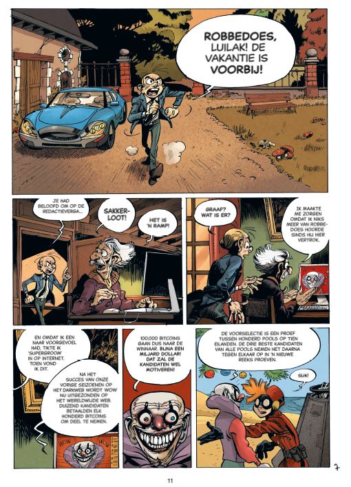 Gemiddelde score 3 / 5Er zijn de laatste jaren heel wat hommage albums de revue gepasseerd waarbij bekende stripfiguren in een nieuw jasje worden gestoken. Zo niet anders voor deze nevenreeks van Robbedoes. Echter hoeft dit zeker geen slechte aanwinst te zijn in vele gevallen. Robbedoes wil na zijn vorige avontuur in deel 1 het rustiger aandoen, maar dit is gerekend buiten de slechteriken van Badass. Die hebben Spip gevangen genomen en chanteren Robbedoes om mee te doen aan een Olympische oorlog met een strijd op leven en dood. Daarbij krijgt de winnaar een bom prijzengeld. Het resultaat is dat Robbedoes verschillende proeven moet doorworstelen om als winnaar uit de bus te komen. Gaandeweg krijgt hij te horen via Superglue (het alter ego van Ijzerlijm) dat deelnemer Zwarthoed slechte bedoelingen heeft en voor het plezier iedereen doodt. Met het prijzengeld zou zijn macht enkel maar vergroten, dus moet Supergroom daar een stokje voor steken. Maar stuntelig als hij is, loopt dit allesbehalve van een leien dakje.. Dit is nummer 2 in de superheldenreeks van Robbedoes, waarbij hij transformeert in een vliegende, maar stuntelige wanna-be superheld. Kwestie van het stoffige imago van de piccolo wat terug op te frissen. En dit werkt, Yoann (tekenaar van oa de Robbedoes reeks en Bob Morane,…) en Vehlmann (auteur van Robbedoes, Alleen, Zeven,...) weten de actie er goed in te houden waardoor de 86 pagina’s (!) vlotjes doorgelezen worden. Keerzijde van de medaille is dat het scenario geen hoogvlieger is, maar dit stoort niet bij dit album. De knappe tekeningen, actie, de nodige humor en de leuk uitgewerkte personages weten je aandacht vast te houden. Dit album is niet ‘super’, maar smaakt zeker naar meer !