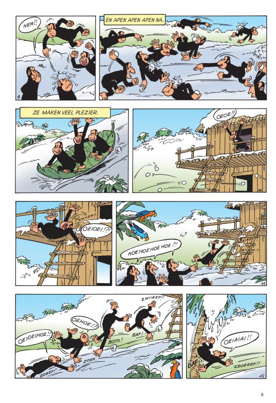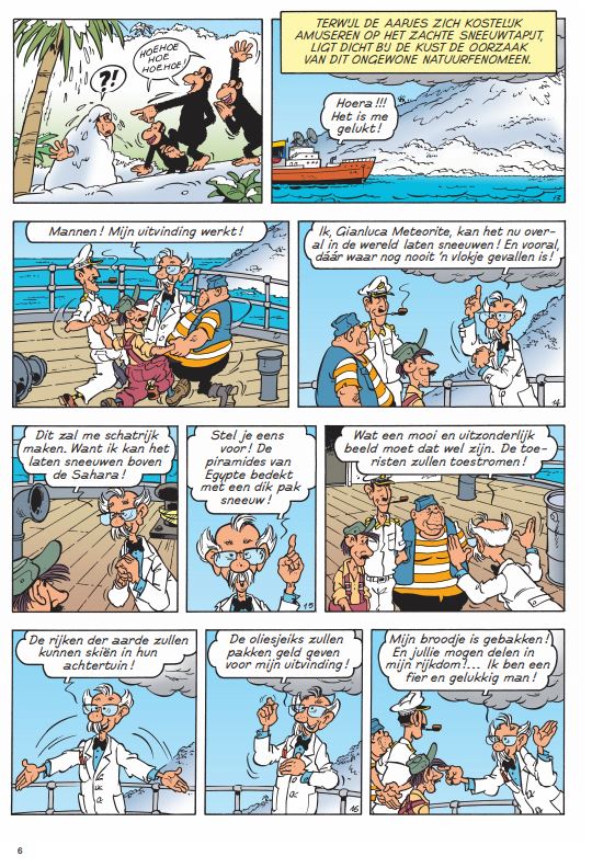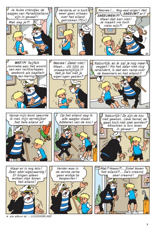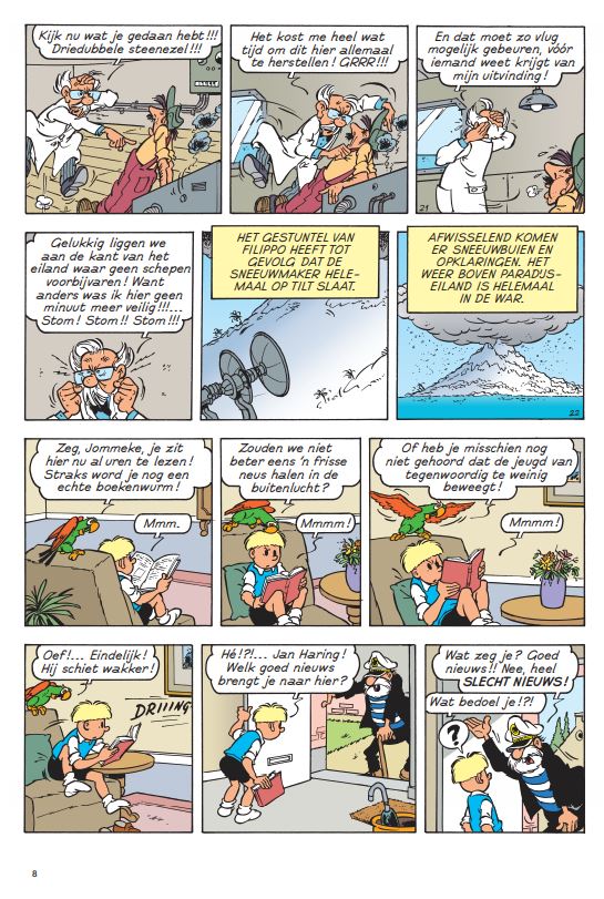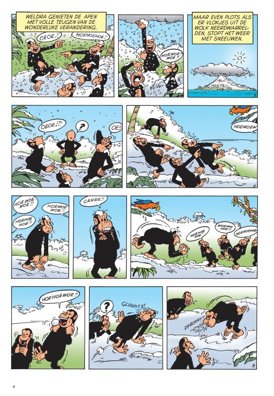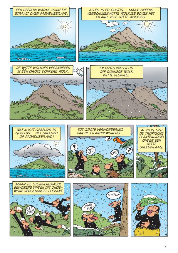 laatste exemplaar Jan Haring heeft vreselijk nieuws. Paradijseiland ligt bedolven onder een dikke laag sneeuw en de aapjes zien blauw van de kou. Jommeke trommelt professor Gobelijn om het merkwaardige natuurfenomeen ter plaatse te gaan bestuderen. Terwijl Filiberke zich over de aapjes ontfermt, gaan Jommeke en Gobelijn op onderzoek uit. Waar komt al die sneeuw toch vandaan?