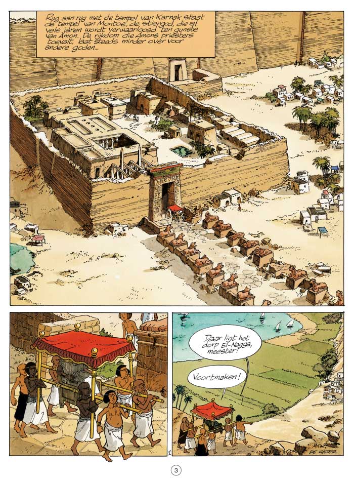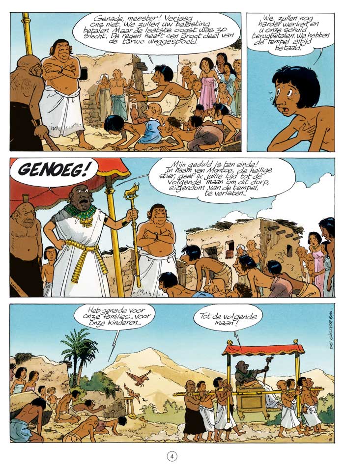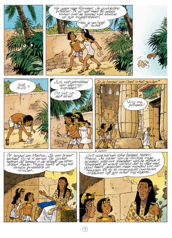 De hogepriester van de tempel van Montoe, een wreed en hardvochtig man, beslist om alle bewoners van het dorp dat naast de tempel ligt te verjagen omdat ze de opgelegde belasting niet kunnen betalen. De kinderen uit het dorp vragen Lief-Er-Theti, de dochter van de farao, om in te grijpen. Maar de hogepriester is heer en meester in zijn tempel en zelfs de farao kan niets ondernemen. Een van de kinderen geeft Theti haar 'schat', een stukje perkament dat ze onderweg heeft gevonden. Papyrus is ervan overtuigd dat het om een plan gaat dat aangeeft waar de schat te vinden is die ergens op het grondgebied van de tempel werd verstopt. Hij trekt met de kinderen op onderzoek uit. Maar Papyrus heeft er dan nog geen idee van dat hij ook geconfronteerd zal worden met de stier van Montoe. Lucien De Gieter, al jarenlang een specialist in het Oude Egypte, levert eens te meer een zeer grondig gedocumenteerd verhaal waarin humor, avontuur en historische elementen zijn verweven ...