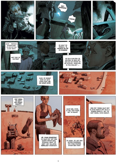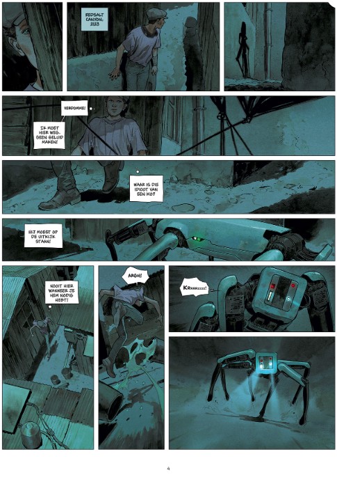 verwacht 2024 Enkel in Softcover Deze Franse striptekenaar Salaün Jaouen (°1979) gekend ook onder zijn pseudoniem Jaouen tekende ook al wat stripreeksen of delen hieruit: Carthago Adventures Eternum Elecboy Een onmogelijke liefde in een post-apocalyptische wereld Eerste deel van een heuse sciencefictionreeks in vier delen van Jaouen Salaün (Eternum), die hier debuteert als compleet auteur • Jaouen tekent en schrijft een sciencefictionverhaal tussen Mad Max en Prometheus Het jaar 2122, ergens in Noord-Amerika. Op een kurkdroge aarde, geblakerd door de zon, lijken vrede en wijsheid vervlogen. De oude, beschaafde wereld heeft plaatsgemaakt voor armoede, geweld en barbaarsheid. In een westerndecor, tussen de provisoire hutten en zonnepanelen, probeert een onafhankelijke gemeenschap te overleven. De zoektocht naar water is een voortdurende bezorgdheid. De jonge Joshua is verliefd op Margot, de zus van Sylvio, een onbeschofte kerel die er plezier in schept hem klappen te verkopen. Sylvio hoort bij de clan van de hoogten, die een terreurbewind voert over de andere inwoners. Op een dag gebeuren er vreemde dingen. Terwijl ze werken aan het waternetwerk worden de vader van Joshua en zijn team aangevallen door vreemde, engelachtige schepsels… in deze post-apocalyptische wereld gaat de strijd voor het overleven voort, tot de wereld vergaat!