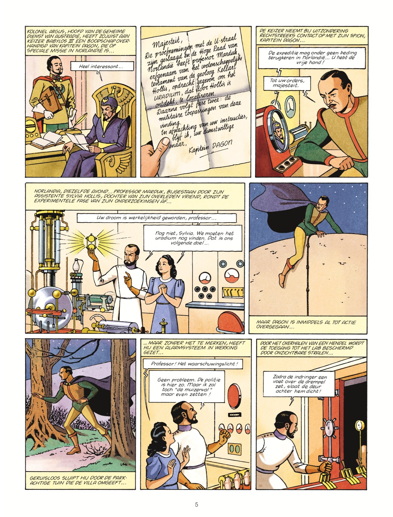 heruitgave van deze strip In 1943 lanceerde een zekere Edgard Félix Pierre Jacobs in het Belgische weekblad Bravo! een saga met de titel De “U” straal. Die was bedoeld als opvolger van de avonturen van Flash Gordon, die door de Duitse censuur was verboden. De beruchte kapitein Dagon, lid van de Austradische geheime dienst, infiltreert in een door Norlandië geleide missie naar de Zwarte Eilanden, die tot doel heeft uradium, een mineraal met wonderbaarlijke eigenschappen, in handen te krijgen. De expeditie zal buitengewone avonturen beleven... Het visuele universum en de personages van De 'U' straal kondigen de avonturen van Blake en Mortimer aan, een reeks waaraan de auteur onder het pseudoniem Edgar P. Jacobs in 1946 met Het geheim van de zwaardvis zal beginnen. Deze nieuwe editie van deze klassieker in de negende kunst is ingekleurd door Bruno Tatti, in overeenstemming met Jacobs' oorspronkelijke palet. Jacobs' waarschuwing heeft niets aan actualiteit ingeboet: de excessen van de wetenschap en de droom van almacht dreigen de mensheid naar haar ondergang te leiden...
