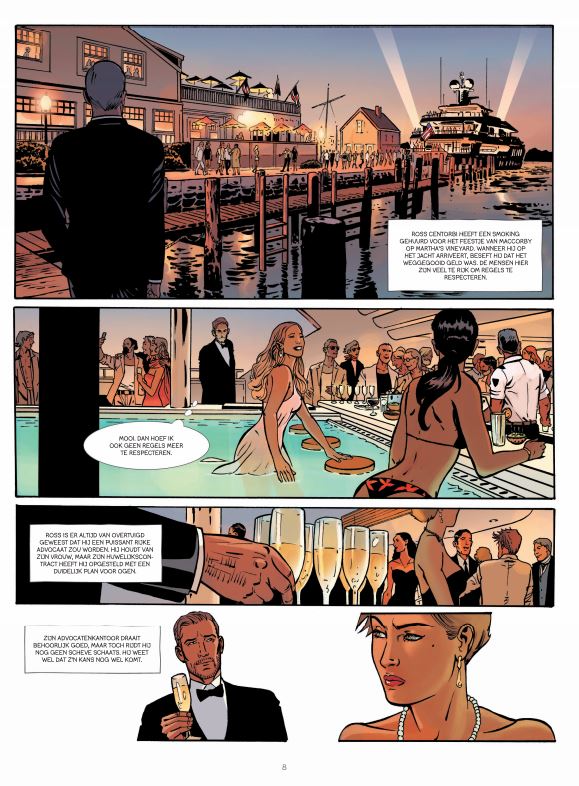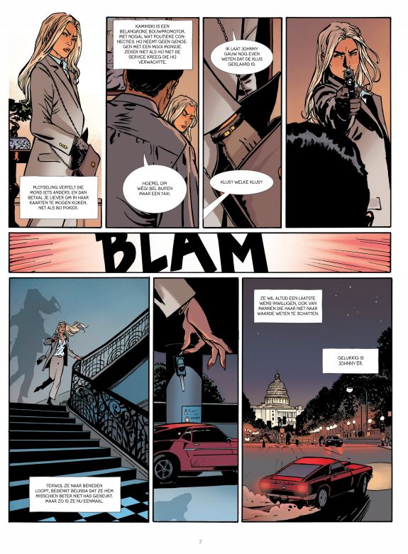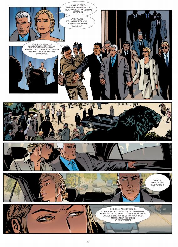 Larry is veertig jaar oud en sinds kort senator. Sinds zijn huwelijk met Diane leidt hij een huiselijk bestaan, met hun twee kindjes. Hij is al een paar weken het doelwit van smerige beschuldigingen. Er wordt gefluisterd dat hij zijn voorganger tot zelfmoord dreef om zijn plaats in te nemen. En wat is er aan van de geruchten over twee zogenaamde maîtresses, Lorna en Jetta, die hem van machtsmisbruik en moord betichten? Het wordt nog erger wanneer Lorna voor de ogen van Larry wordt vermoord en het moment wordt vastgelegd door een jonge fotograaf. Iemand chanteert de senator en wil dat hij zijn ontslag aanbiedt. Larry moet de afperser snel vinden en zijn naam zuiveren, voor hij alles verliest Striptekenaar Bernard Vrancken tekende ook nog H.ell Zwart Bloed ( Le Lombard ) Stripscenarist Desberg Stephan ( Brussel, ° 1954) woont momenteel in Amerika, schreef oa volgende reeksen bij elkaar • Baard en Kale • 421 • Billy The Cat • Black OP • Cassio • De 27ste Letter • De Engelen van Auschwitz • > De Leeuw van Juda • DE Nieuwe avonturen van Jimmy Van Doren • De Onsterfelijken • De Schorpioen • 1000 en meer nachten • Empire USA • Golden Dogs • Hell • Het laatste Junglebook • IRS All Watcher • Jack Wolfgang • Jimmy Van Doren • Renaissance • John Tiffany • Mayam • Miss Oktober • Cryozone • Oliver Page • SOS Geluk • Shayne • Sherman • Sienna • Spervuur • De Ster van de Woestijn • Tosca • Volle Melk
