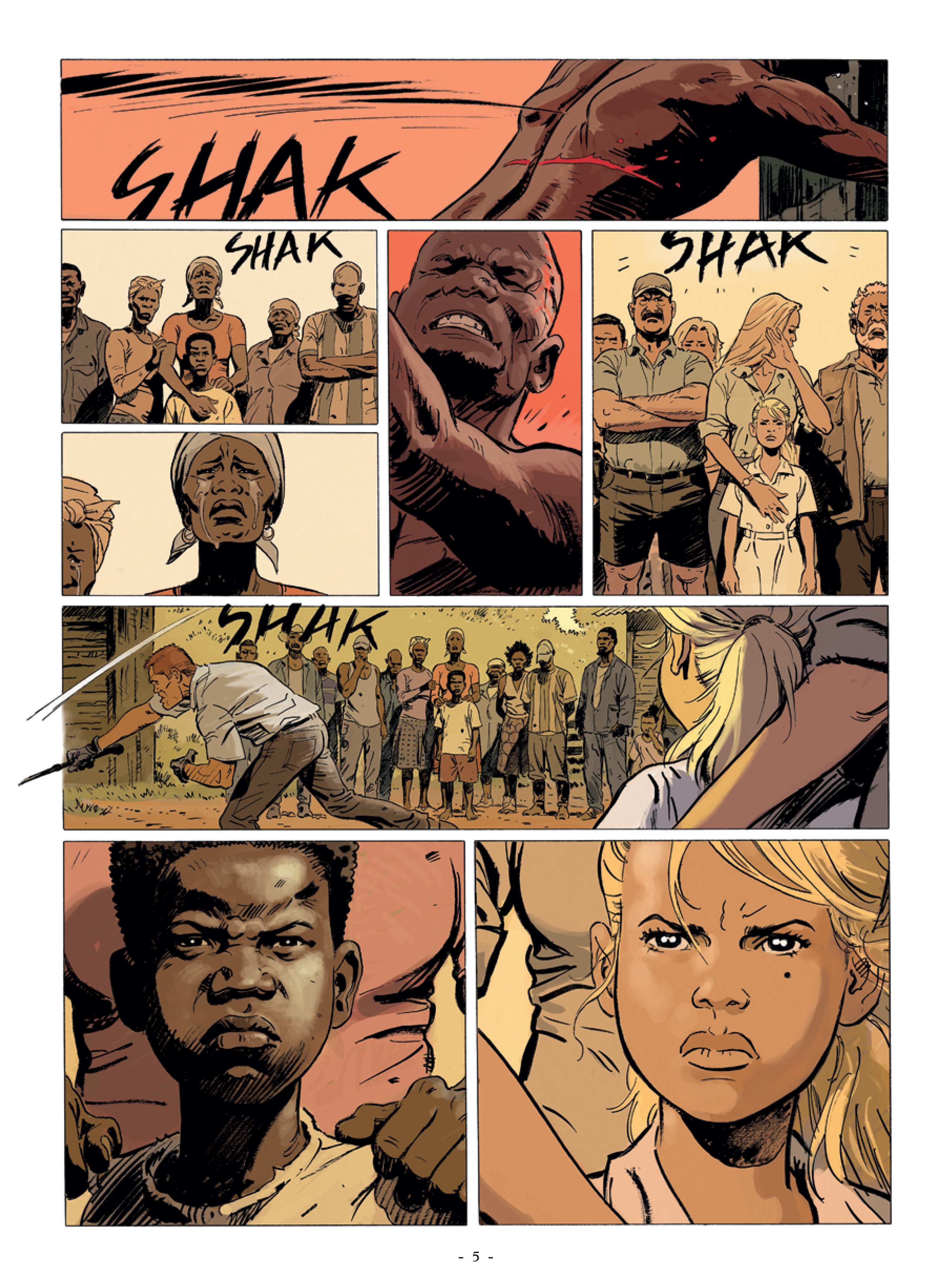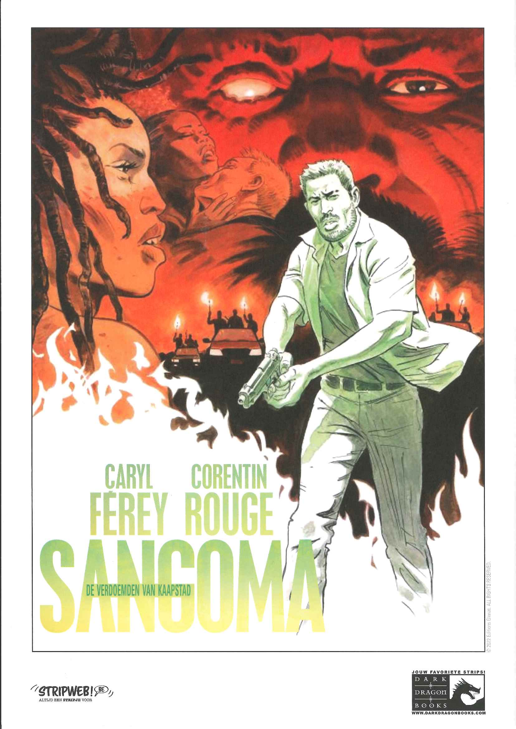 Van dezelfde scenarist als maori er bestaat ook een Speciale Stripwebversie met heel wat extra's rond deze strips te voorzien.... schrijf je in en volg op sociale media voor de extraatjes rond deze strip... ==> Sangoma Zuid-Afrika vandaag. Veel wolken vertroebelen de dromen van de Rainbow Nation en de beloften van een rechtvaardige en egalitaire samenleving zijn verloren gegaan op de in de Great Plains. Simpel gezegd, de zwarten zwoegden altijd in dienst van de blanken en ellende heerst in het hart van de Townships. Een vonk en het is de explosie: rellen, geweld, politieke manipulaties en oude overtuigingen accentueren het dagelijks leven. Het is in deze sfeer dat Trane Shepperd optreedt, een luidruchtige politieluitenant, verleider en liefhebber van mooie auto's. Dit weerhoudt hem er niet van gewetensvol te zijn en zijn best te doen om de draden van zijn onderzoek te ontrafelen. Daar werd hij naar de plaats van een moord op een wijnmakerij geroepen. Een onduidelijke affaire waar niemand de hele waarheid lijkt te vertellen, Eva Pienaar, in de eerste plaats de dochter van de baas... Caryl Férey keert terug naar strips en zijn eerste liefde met Sangoma, een huiveringwekkende en ultra-gewelddadige thriller. Zoals gebruikelijk gebruikte de schrijver-reiziger zijn fijne kennis die hij had opgedaan tijdens lange verblijven in een regio - hier na Mandela Zuid-Afrika - om een thrillerplot ook te voorzien van een veelvoud aan informatielagen die relevant zijn voor gewone stervelingen. Ja, de toon is hard en de acties grenzen aan ondraaglijk, maar alles klinkt waar en opwindend. De scenarioschrijver animeert een solide cast bevolkt door zeer goed gedefinieerde protagonisten en hij beschrijft op intelligente wijze een complex en moeilijk sociaal-economisch kader. Het zijn geen simpele 'papieren acteurs', hun persoonlijkheden en hun diepgaande psychologie brengen echte diepte in het verhaal. Verschillende schokkende onthullingen en een afgemeten dosis van honderd procent adrenaline-actiescènes eindigen in deze aangrijpende en verstikkende lezing. Met zijn tekenpincelen doet Corentin Rouge uitstekend werk. Een traditioneel realistische lijn die soms doet denken aan Jean Giraud, gekoppeld aan een strakke snede, het resultaat is opgewassen tegen de uitdagingen. De ontwerper had ook plezier met enkele zeer indrukwekkende grote composities van dubbele pagina's. Enige minpuntje, de algemene sfeer blijft generiek en mist een beetje gevoel. De bijzondere energie en unieke kleuren van het donkere continent worstelen om een cinematografisch fineer te doorbreken dat praktisch in Hollywood is gemaakt. Met een verhaallijn die gewoonlijk is voorbehouden aan de meest gemartelde Noordse misdaadromans, presenteren Férey en Rouge een extreme versie van Zuid-Afrika die zelden naar voren wordt gebracht. Rijk, bloederig en gespannen, Sangoma zal niemand onverschillig laten. wacht even