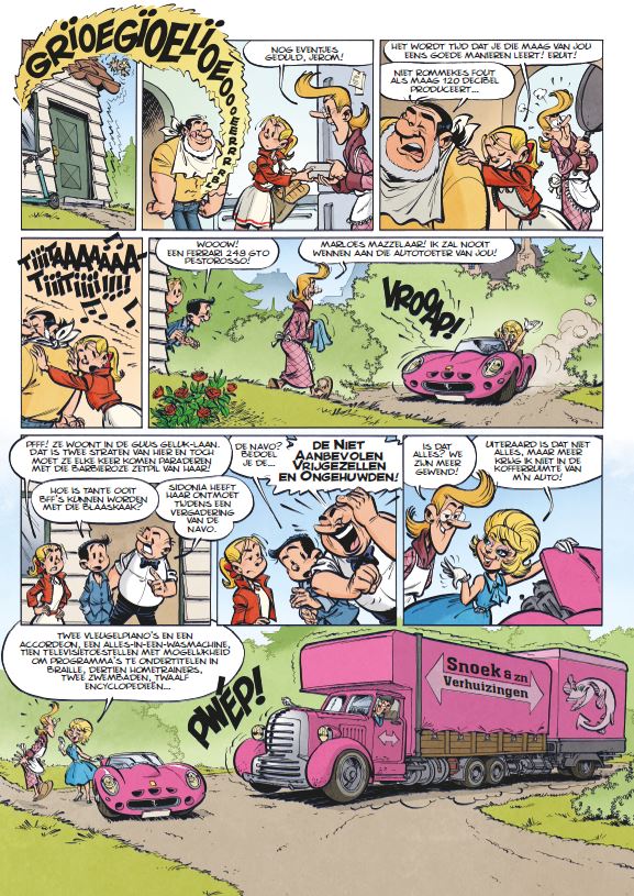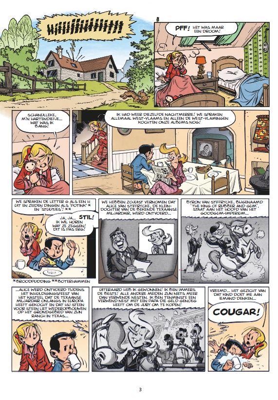 Gemiddelde score 4 / 5Spattend sixtiessausje Anno 1951 verscheen het De Tuf-Tuf-club, een Suske en Wiske-album geschoeid op de goede oude Vandersteen-leest. Daarmee bedoelen we een historische setting met veel fantasie-elementen, een vleugje magie, een pak mysterie en vooral die o zo typische humor met een knipoog naar de actualiteit van de dag... Menig fan zal zich dit album ook herinneren omdat Vandersteen een en ander lost over de familie van tante Sidonia. Zo komen we te weten dat ze een nakomelinge is van baron van Stierlijke. Jawel, Sidonia van Stiefrijke... Klinkt fancy! Niet? Over naar de orde van de dag. Sinds 2017 verschijnt jaarlijks een Suske en Wiske door... Gerben Valkema en Yann, het duo dat in 2016 de spits afbeet met Cromimi, komt een tweede maal aan zet. De Vroem-Vroem-club lijkt niets minder dan een remake van De Tuf-Tuf-club met Kovertol, een (witte) raaf, Stiffryckes en veel autogeweld... Een remake, maar dan wel met enkele belangrijke twists... Zo speelt De Vroem-Vroem-club zich af in 1966 en dan nog grotendeels in Texas. Deze setting laat de scenarist toe om volledig uit zijn dak te gaan in een door hem geliefde historische periode. Het album ademt bovenal ook een heerlijk sixtiessfeertje uit. Compleet met Amerikaanse Koude Oorlogparanoïa en heerlijke hot rods ter vervanging van Vandersteens Tuf-Tuf-autootjes. Yann serveert een heerlijk snel verhaal bomvol referenties naar het originele album en per uitbreiding naar de hele reeks. De humor die Willy Vandersteen in zijn verhalen deed sluipen, was en is nog steeds uniek. Niet altijd gemakkelijk te begrijpen en vaak ook pas als volwassene volledig te bevatten. De humor die Yann en Gerben gebruiken is veel meer slapstick. Lambik is bij momenten dezelfde idioot als vanouds, maar wordt hierin dapper bijgestaan door Jerom, die eigenlijk ondanks zijn spieren ook wel een beetje een angsthaas is en even dwaze dingen doet als Lambik. Ze zijn elkaar waard, pleegt men hier te zeggen. Suske is dan weer een held op sokken terwijl Wiske... gewoon weer Wiske is, maar dan met een meer sarcastisch tintje. Het tekenwerk van Gerben Valkema is zwierig, vrank en vrij, maar vooral ook erg consistent. Het sixtiessausje spat eveneens van de tekeningen af. Sfeer, sfeer en nog eens sfeer, alsof Valkema niets anders tekent dan dit. Tenslotte toch ook een pluim voor de inkleuring van Shirow Di Rosso. Lekker modern, en met de nodige licht- en schaduweffecten, zoals we dat van hem intussen gewend zijn. Al deze elementen in de mixer maken van De Vroem-Vroem-club een bijzonder geslaagd album. Een ode aan Suske en Wiske en bij uitbreiding ook een ode aan de Negende Kunst. De verwijzingen naar andere reeksen en cameo’s zijn dan ook legio. Oplettende lezers en nitpickers gaan hun handen vol hebben aan het album, zodat een tweede en zelfs derde leesbeurt op korte termijn tot de mogelijkheden behoren. Wie een paar euro extra wil besteden, is er een knappe hardcover met extra achtergrondinformatie die ons alvast aanspoorde om ons stukgelezen exemplaar van De Tuf -Tuf-club nog eens boven te halen. Over de gehele lijn geslaagd dus!