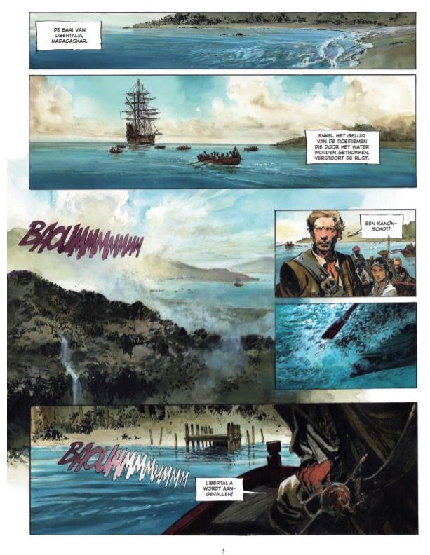 Hoe de utopie recht naar de hel leidt ... Libertalia: mythe of werkelijkheid? In 1726 alludeert Daniel Defoe al op het bestaan van deze anarchistische piratenstad. Aan het hoofd van deze mysterieuze utopie van het einde van 17e eeuw vinden we Misson en Carracioli. De ene is een Franse aristocraat, gedreven door grote revolutionaire ideeÎn, de andere is een uitgetreden Italiaanse priester. Het uur van de waarheid heeft geslagen voor Libertalia. Het water tussen beide mannen is veel te diep, elk onderwerp zorgt voor tweedracht: de doodstraf, de verdeling van de rijkdom, huwelijken tussen Liberi en Natuurlijken ... De inwoners van Libertalia worden nog altijd nagezeten door Dalbarade, de gewapende arm van de Europese grootmachten. Al snel wordt voor de inwoners van Libertalia pijnlijk duidelijk dat een utopie de ergste wantoestanden kan voortbrengen ... Laatste deel van dit grootse piratenavontuur. Voor de fans van Long John Silver. Libertalia zou een vrijstaat zijn geweest die vanuit utopistische motieven door piraten werd gesticht.
