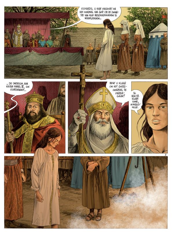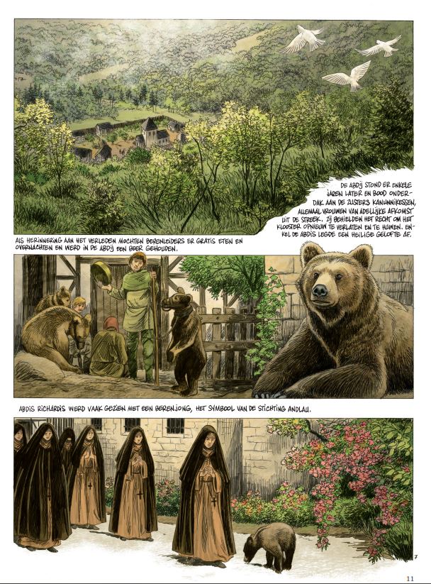 Wanneer keizer Karel III de Dikke zijn vrouw Richarde in 880 verstoot, keert ze na een visioen terug naar de Elzas, haar geboortestreek. Op de plek waar een berin in de aarde woelt om haar jong te begraven, moet zij een abdij stichten. Een paar jaar later rijst de abdij van Andlau daar op, voor eeuwig verbonden aan dat dier, de koning van het woud. Heel wat jaren later, in 1760, midden in de vallei van Munster, viert een dorp feest. De jonge zoon van de belangrijkste boer uit de regio laat het hart van Eva en Maria niet onberoerd. De tweeling vindt hem leuk. Maar zijn vader heeft er geen goed oog in en verbiedt zijn zoon nog met hen om te gaan. Maar verboden zijn er om overtreden te worden, en als je 18 bent, denk je nog niet aan de toekomst. Als er een beer opduikt in de vallei, proberen de jagers het beest op te sporen. Maar Eva wil het beest als eerste zien, want zij kent de legende van Andlau en wil het gigantische dier in het echt zien. Maria is minder kalm, maar volgt haar toch. Onder het lover en in de bergen raakt het lot van deze mensen en dieren verbonden. In een beeldende en poëtische tekenstijl vertelt Servais een Elzassische legende. Een tragisch en subliem verhaal dat je laat stilstaan bij de geheimen die deze prachtige streken nog bevatten.