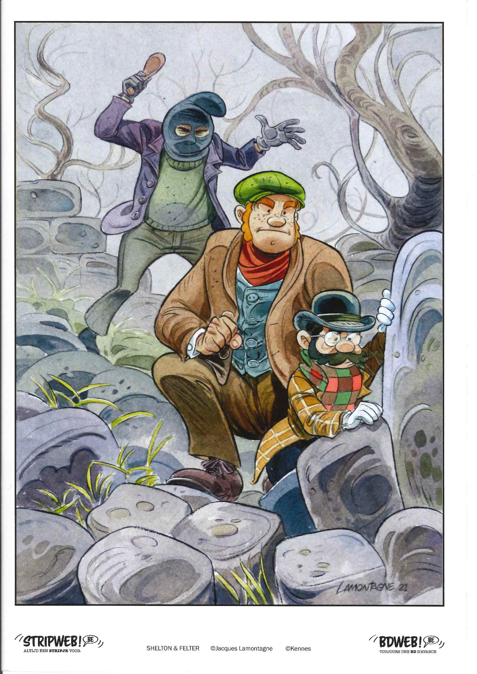 er bestaat ook een stripweb editie van deze strip op slecths 150 ex = Shelton en Felter Luxe Schitterende nieuwe reeks waarvan je als stripliefhebber alleen maar fan kan zijn, mooie & spannende verhalen, verterende personages en tekeningen om u tegen te zeggen. een topreeks!!!! Striptekenaar Lamontagne werkt ook aan volgende stripreeksen 1. Aspis 2. De Druiden 3. Haven 4. Yuna 5. Shelton&Felter Boston, 1924. Als hij niet op een dag zijn schouder tijdens een bokswedstrijd ernstig had ontwricht, zou Isaac Shelton vandaag waarschijnlijk nog steeds zijn vak als dokwerker op de dokken uitoefenen. Maar toen hij zich moest omscholen, ontmoette hij als freelance journalist Felter, een kleine boekhandelaar met een passie voor detectiveliteratuur. De eerste is atletisch en nogal knap (als niet voor een lelijke gebroken neus, nog een herinnering aan vechten); de tweede is begiftigd met een krachtig waarnemingsvermogen en een buitengewone analytische geest (kwaliteiten gecompenseerd door een hypochonder temperament). Gedreven voor de één door de behoefte om een lonende primeur te krijgen en voor de ander door de wens om als zijn literaire helden te zijn, zullen de twee vrienden hun krachten bundelen in een poging licht te werpen op een reeks ongewone moorden.