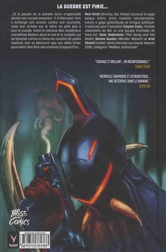 ...Et le peuple de la planète Gorin s'agenouille devant son nouvel empereur : X-O Manowar ! Aric a échangé son armure contre une couronne, mais son arrivée sur le trône ne plaît pas à tout le monde. Entre la menace des mystérieux monolithes flottant dans le ciel et le complot qui se fomente contre lui dans les couloirs du palais impérial, Aric va découvrir que ses alliés d'hier pourraient bien être ses ennemis d'aujourd'hui...