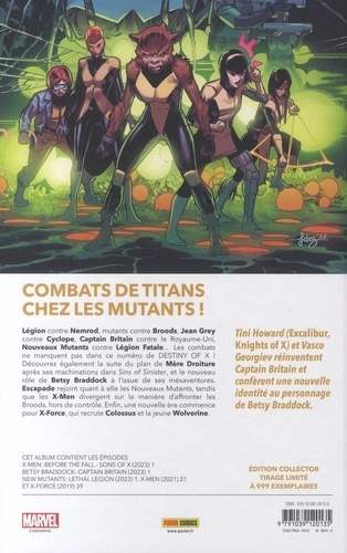 Diablo est aux mains d'Orchis et Légion est prêt à tout pour le libérer... même à affronter Nemrod ! Une aventure qui va laisser des traces. Une nouvelle ère commence pour Betsy Braddock, alias Captain Britain. Conclusion de l'affrontement entre les Broods (mystérieusement devenus fous) et les X-Men. Face à d'innombrables doubles de lui-même, Wolverine est-il toujours le meilleur dans sa partie ? Et Colossus et Laura Kinney rejoignent X-Force ! Du sang neuf dans les pages de DESTINY OF X ! Captain Britain est l'héroïne d'une nouvelle série, dans la continuité d'Excalibur, tandis qu'un épisode one-shot essentiel pose les bases de Fall of X, qui occupera les mutants dans le courant du premier semestre 2024.