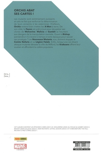 Orchis met son plan en action ! Les mutants sont plus forts que jamais, mais ça n'en rend leurs ennemis que plus déterminés ! Plus grande sera la chute ? Quand une petite ville de la Nouvelle-Angleterre est frappée par ce qui semble être une attaque mutante dévastatrice, c'est à Krakoa d'intervenir. C'est l'heure du combat final pour Wolverine face aux armées de clones du Fauve. Gambit et Malicia découvrent des secrets fracassants et c'est la fin du voyage pour les Nouveaux Mutants et Bishop. La chute est pour bientôt ! En mars, DESTINY OF X laissera la place à FALL OF X, il est donc temps de boucler les histoires en cours et d'ouvrir la voie à une période sombre pour les mutants. Les séries New Mutants : Lethal Legion et Bishop : War College s'achèvent ici !