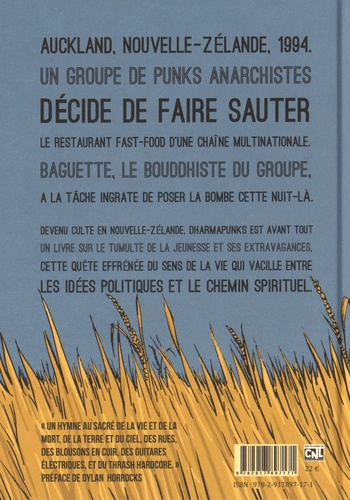Auckland, Nouvelle-Zélande, 1994. Un groupe de punks anarchistes décide de faire sauter le restaurant fast-food d'une chaîne multinationale. baguette, le bouddhiste du groupe, a la tâche ingrate de poser la bombe cette nuit-là. Devenu culte en Nouvelle-Zélande, Dharmapunks est avant tout un livre sur le tumulte de la jeunesse et ses extravagances. Cette quête effrénée du sens de la vie qui vacille entre les idées politiques, et le chemin spirituel.